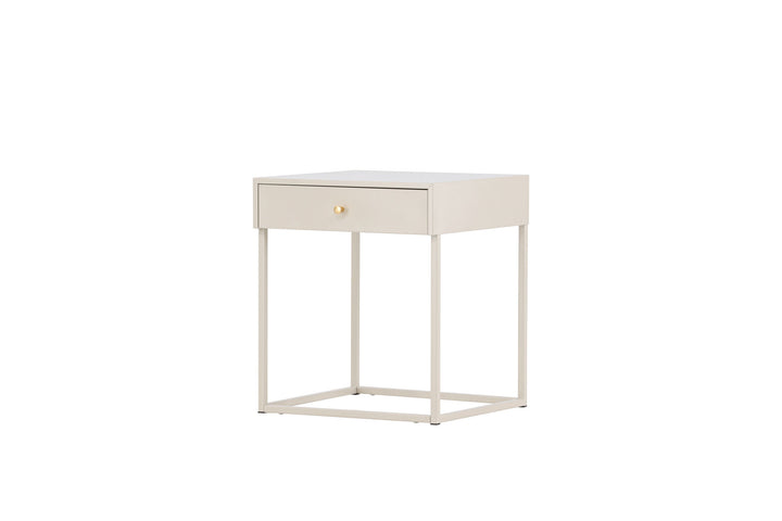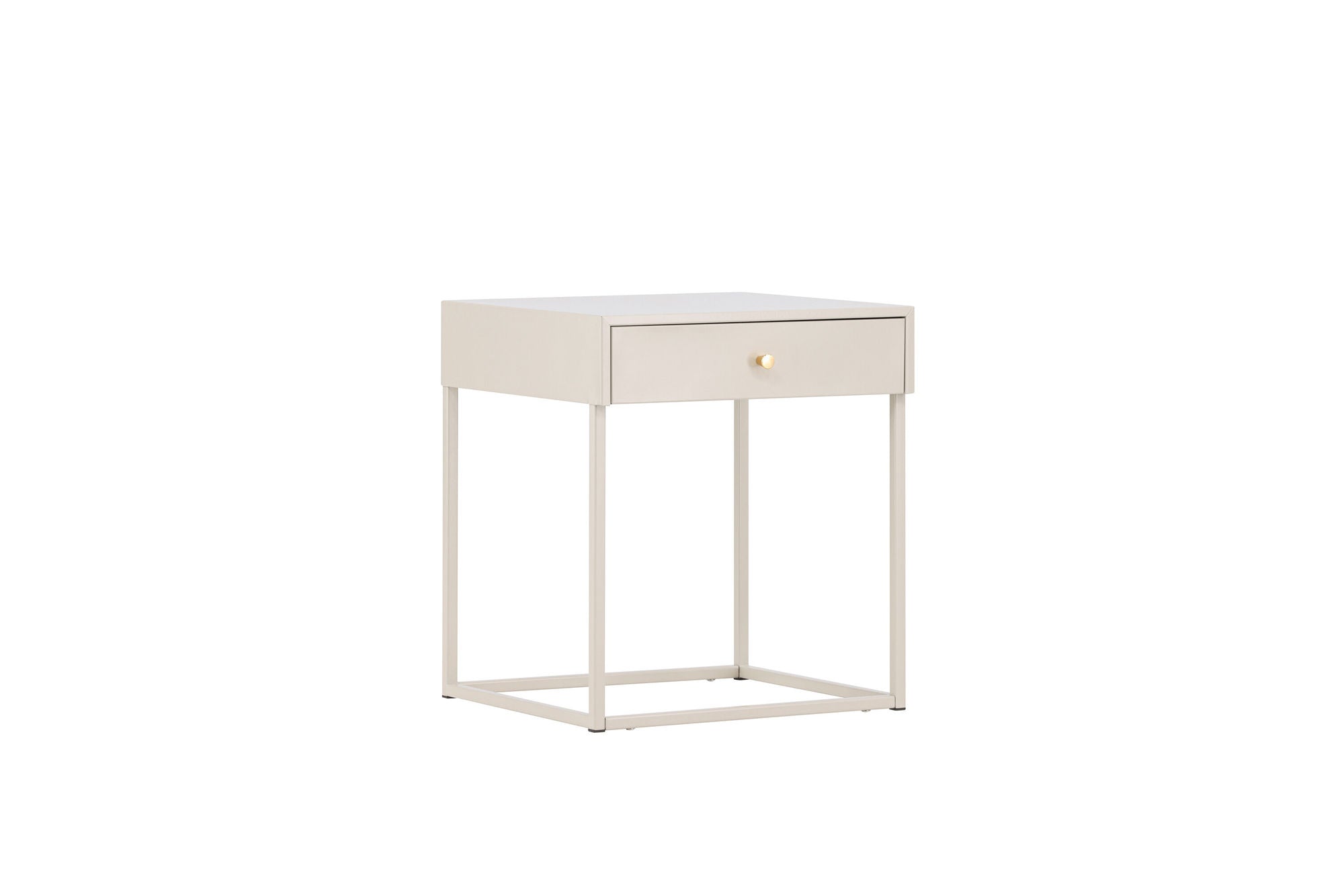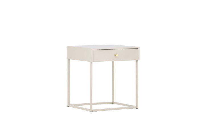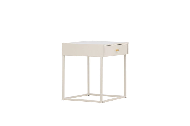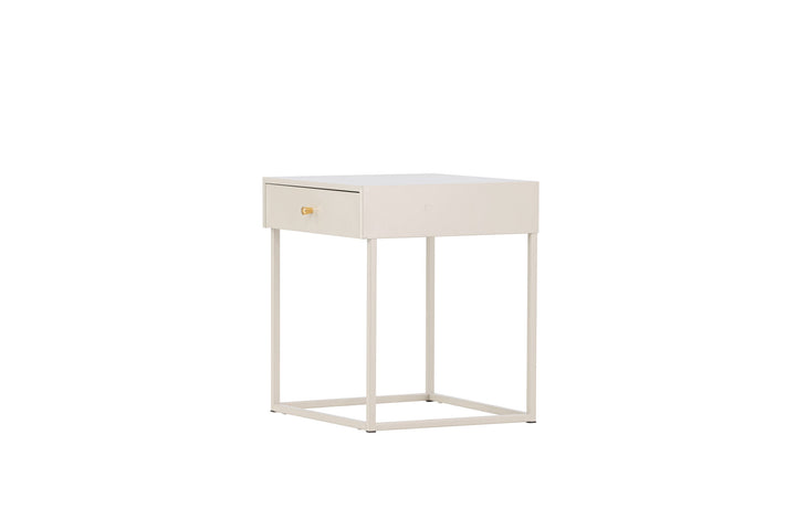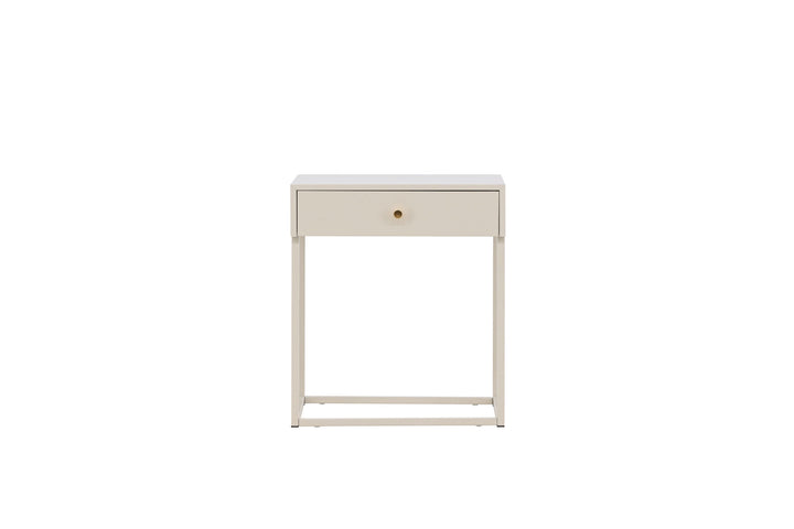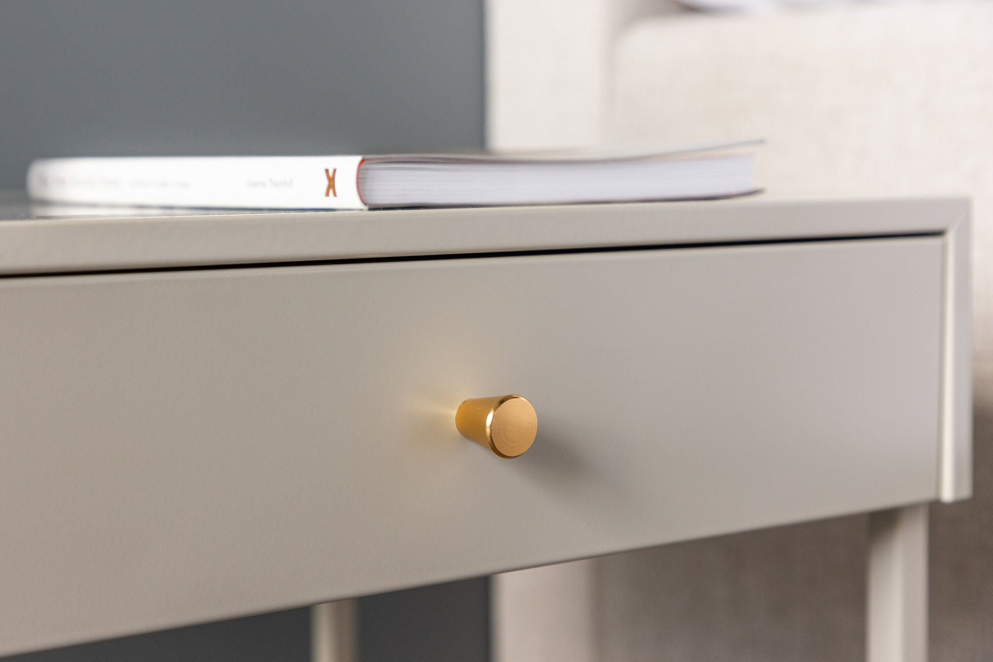 Der Nachttisch ist mit einer praktischen Schublade ausgestattet, die dank des edlen, messingfarbenen Griffs einen besonderen Akzent setzt. Perfekt, um Bücher, Brille oder kleine Alltagsgegenstände stilvoll und griffbereit zu verstauen.