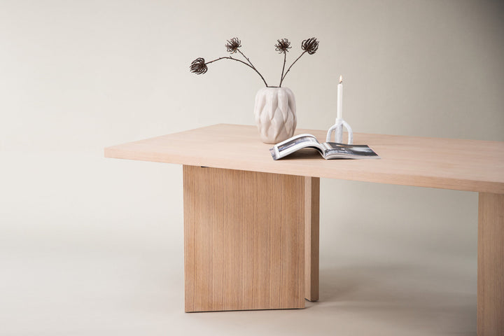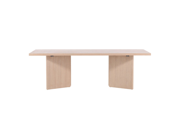 Die Tischplatte und Beine bestehen aus weiß veredeltem Holz, was dem Tisch einen zeitlosen, frischen Look verleiht. Die leicht ausgestellten Beine unterstreichen das nordische Design und sorgen zugleich für Stabilität und Robustheit.