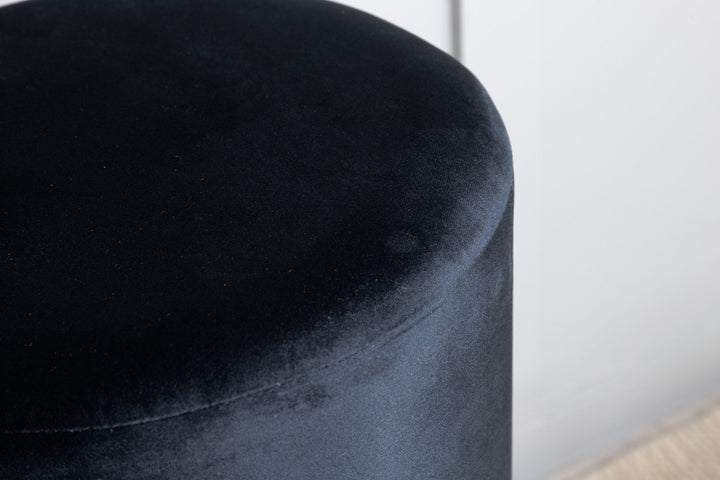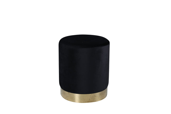 Der zylinderförmige Hocker ist mit edlem schwarzem Samtstoff bezogen, der dem Möbelstück eine elegante Tiefe und einen feinen Glanz verleiht. Das goldfarbene Metallgestell sorgt nicht nur für Stabilität und Langlebigkeit, sondern setzt zugleich einen dekorativen Akzent, der den luxuriösen Charakter unterstreicht.