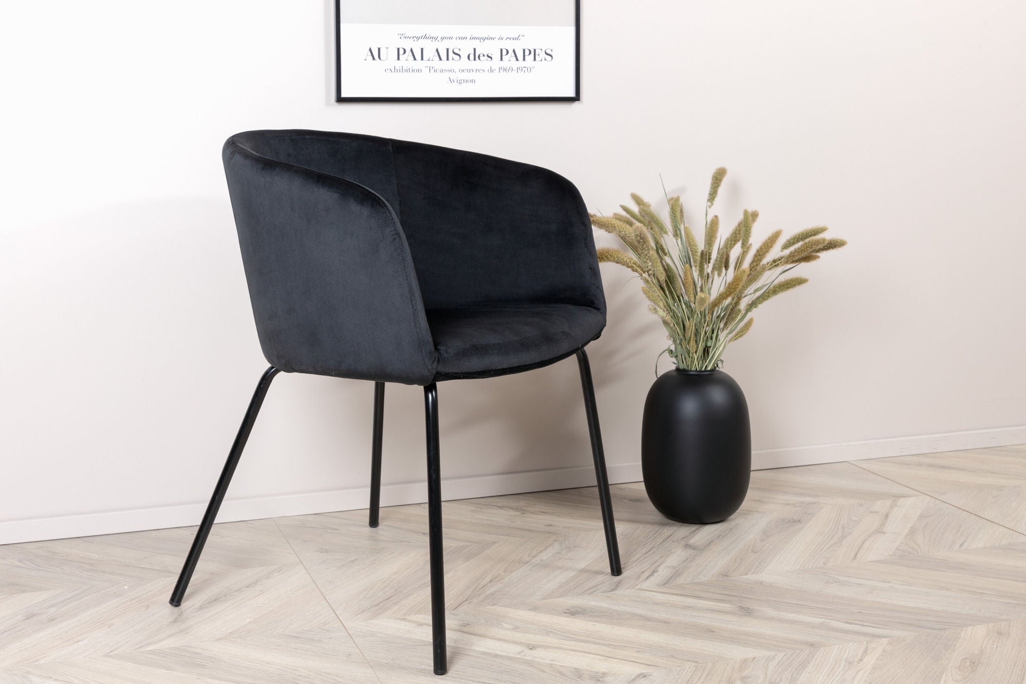 Zeitlos, modern und elegant – der Berit Stuhl in edlem Schwarz verleiht Ihrem Essbereich eine luxuriöse Atmosphäre. Mit seinem rundum gepolsterten Design, der sanft geschwungenen Rückenlehne und der Sitzfläche in hochwertigem Samt mit feiner Polyester-Leinen-Struktur vereint er Komfort und stilvolles Design auf höchstem Niveau.
