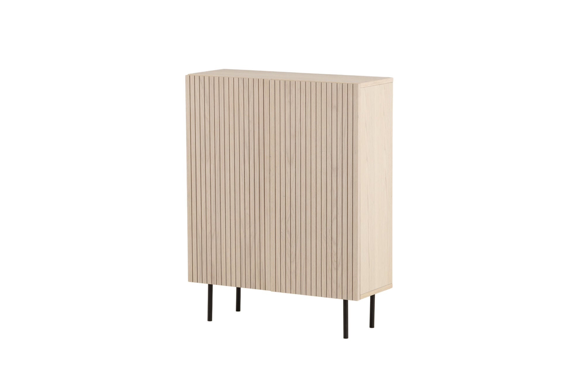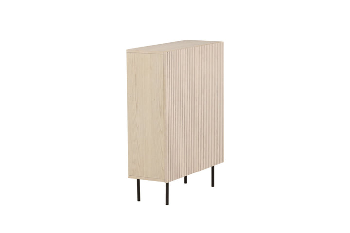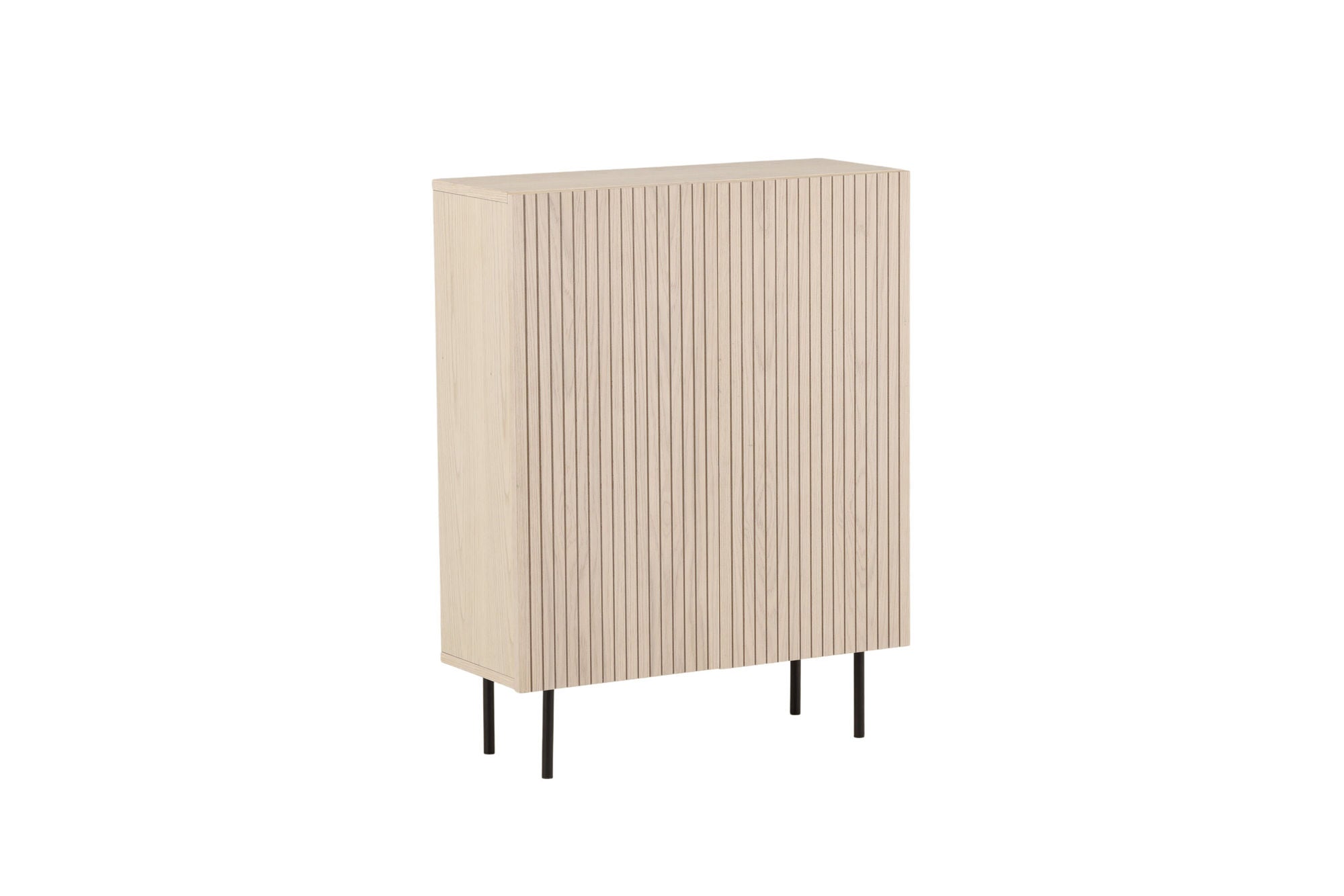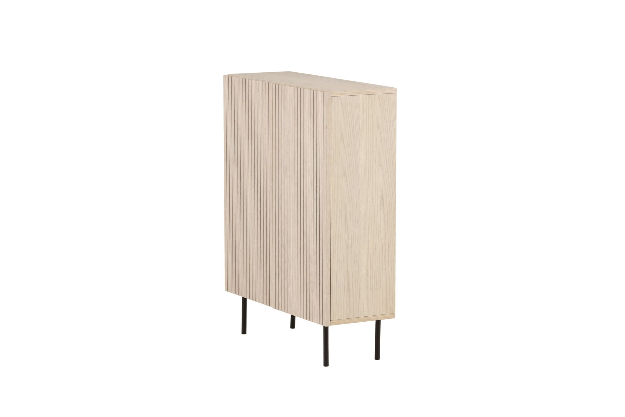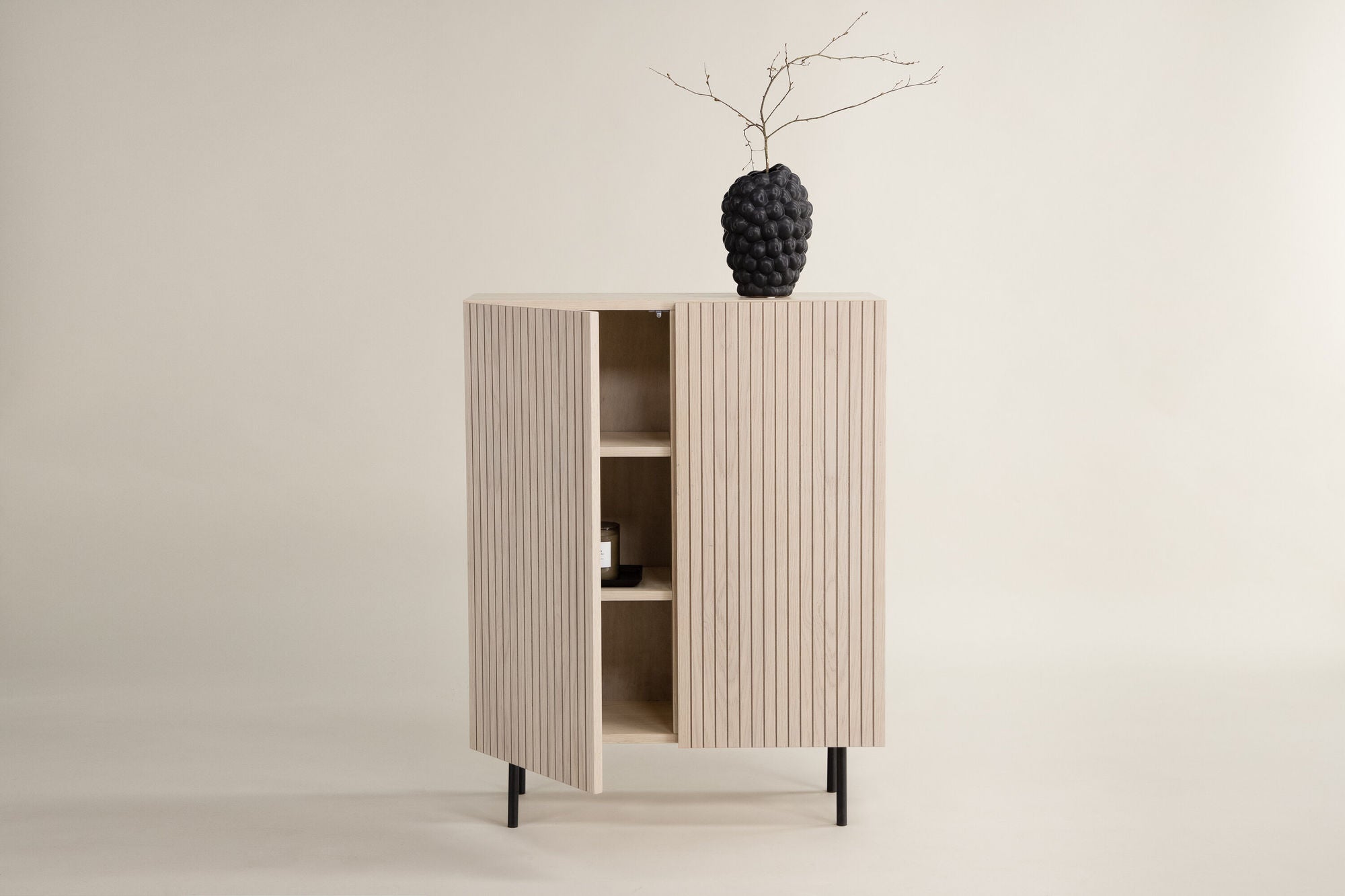 Hinter den zwei Türen mit markanter Rippenstruktur verbergen sich drei Einlegeböden, die reichlich Stauraum für Bücher, Geschirr oder persönliche Dinge bieten. Das Highboard ist aus weiß gekalktem Furnier gefertigt und wird von schmalen schwarzen Stahlbeinen getragen, die für Leichtigkeit und ein modernes Erscheinungsbild sorgen.