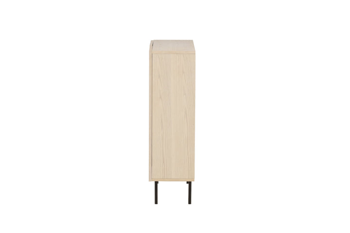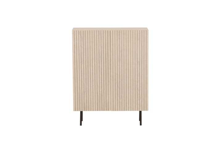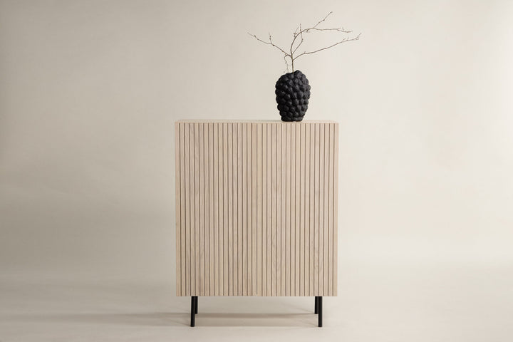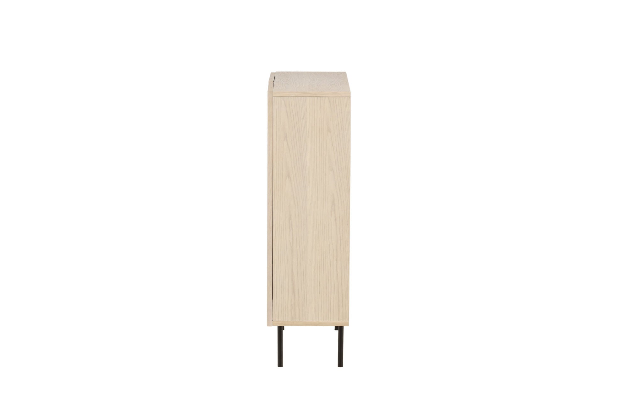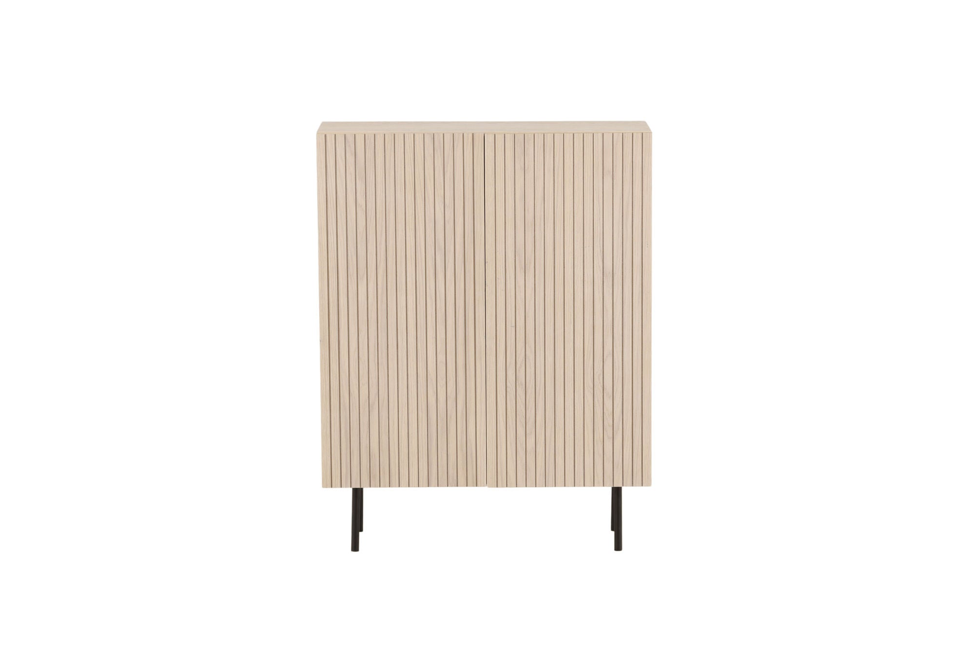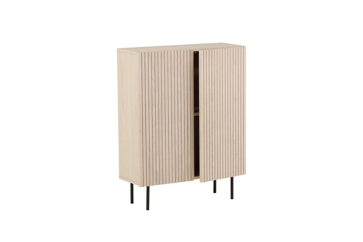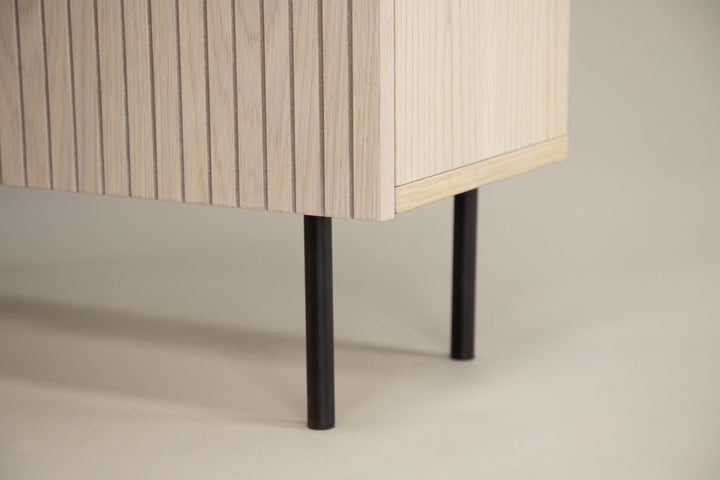 Hinter den zwei Türen mit markanter Rippenstruktur verbergen sich drei Einlegeböden, die reichlich Stauraum für Bücher, Geschirr oder persönliche Dinge bieten. Das Highboard ist aus weiß gekalktem Furnier gefertigt und wird von schmalen schwarzen Stahlbeinen getragen, die für Leichtigkeit und ein modernes Erscheinungsbild sorgen.