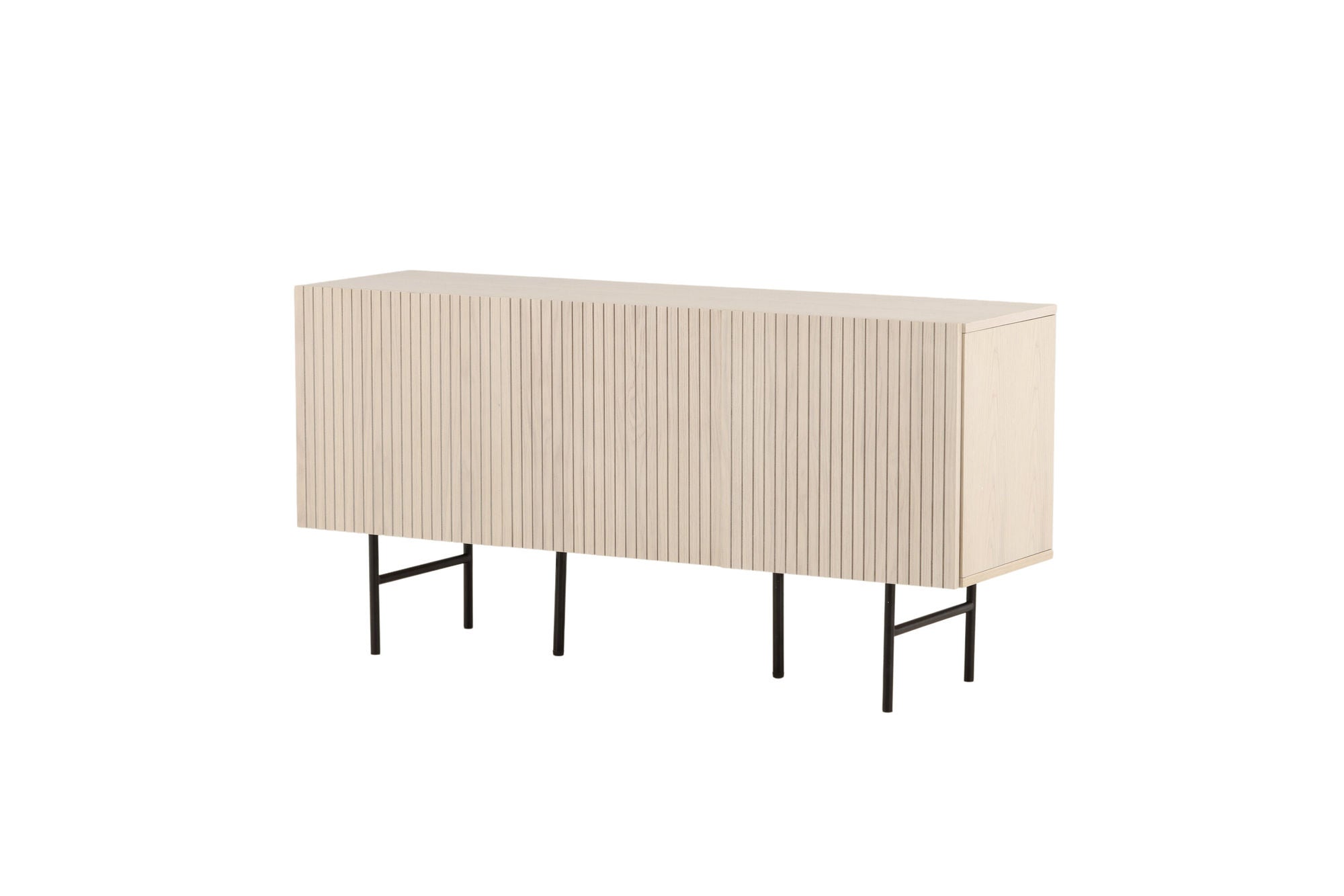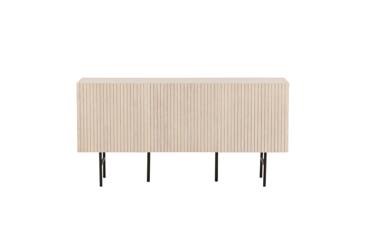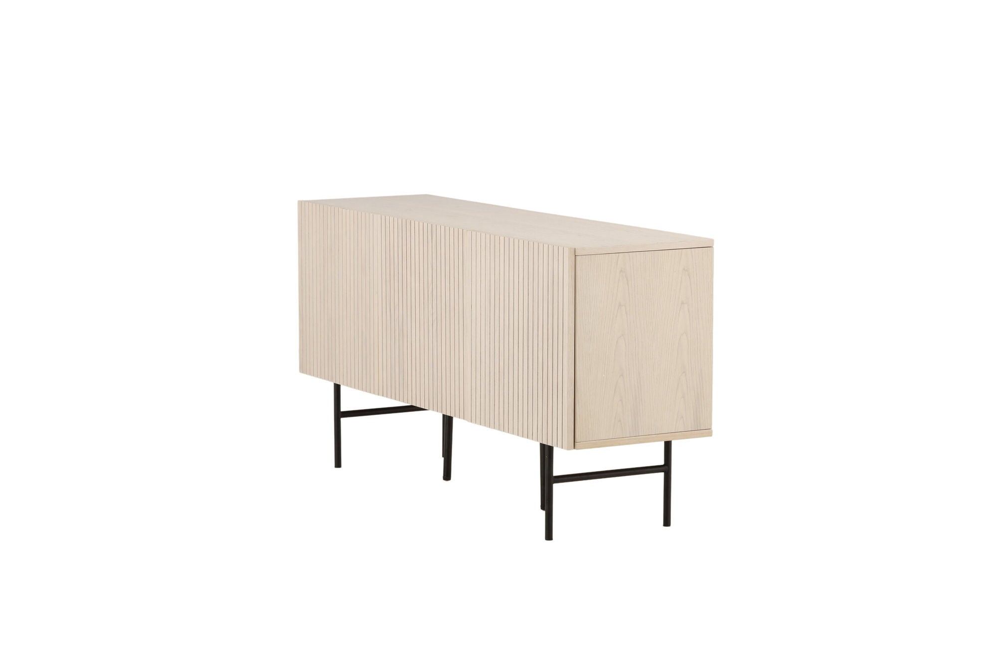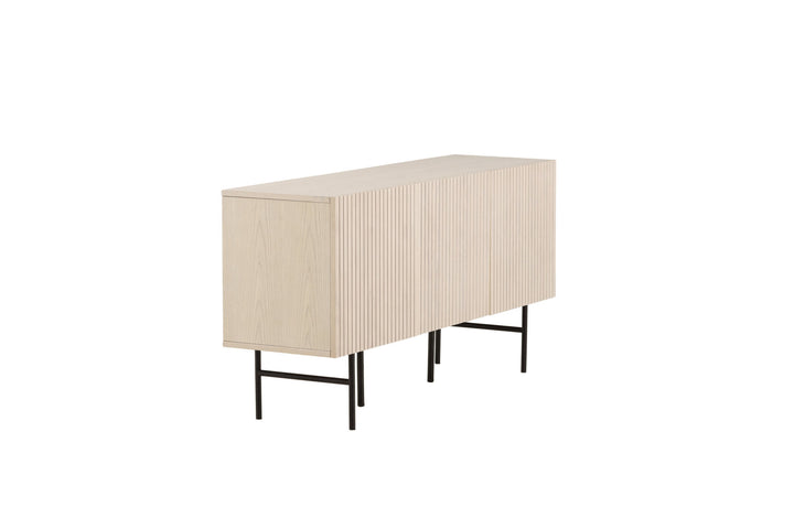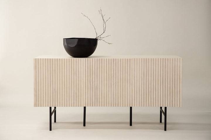 Das Lowboard Björkön vereint skandinavische Klarheit mit praktischer Funktion. Gefertigt aus weiß gewaschenem Furnier und getragen von einem filigranen Gestell aus schwarzem Stahl, bringt es Leichtigkeit und Eleganz in Ihr Zuhause.