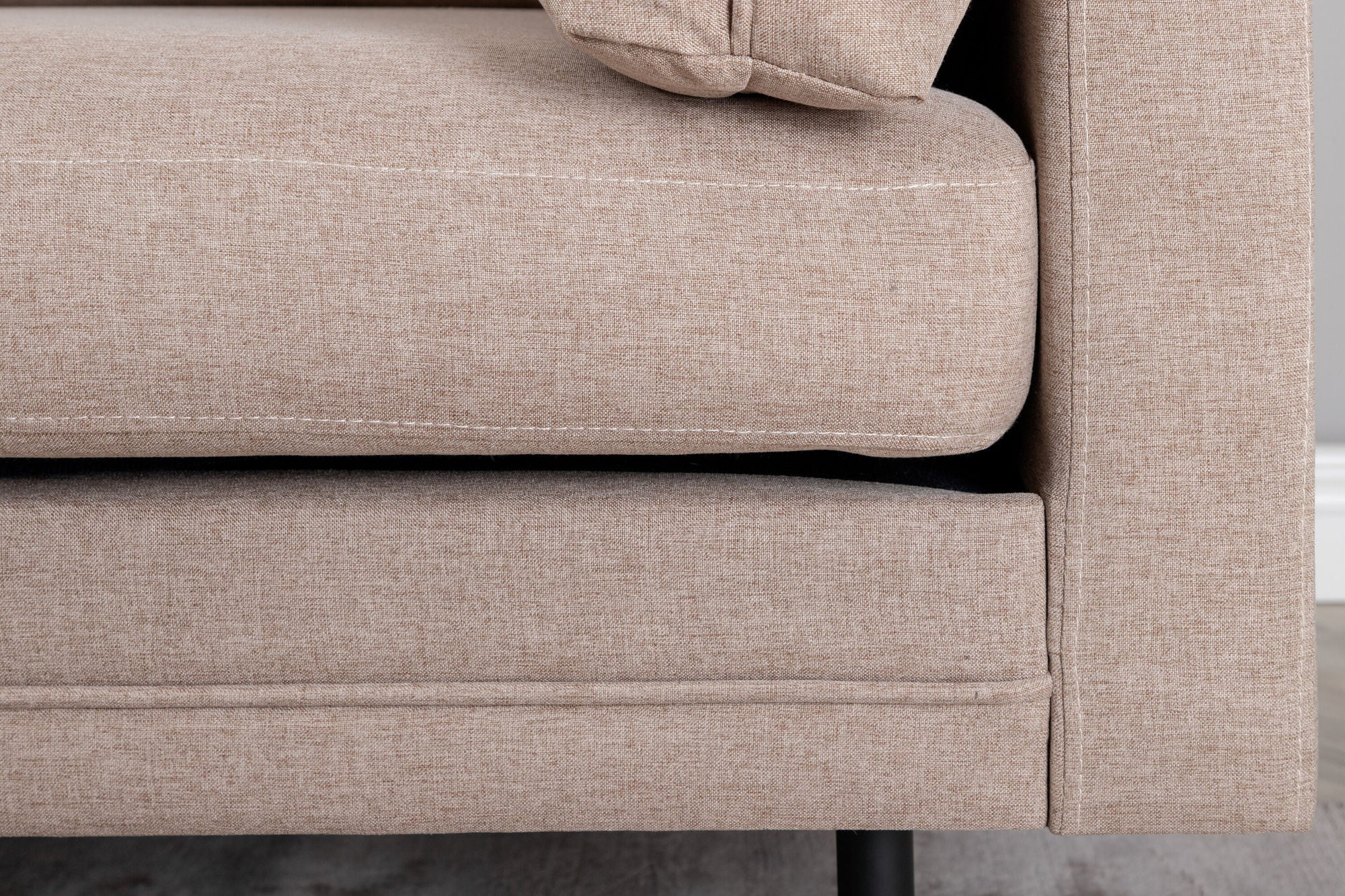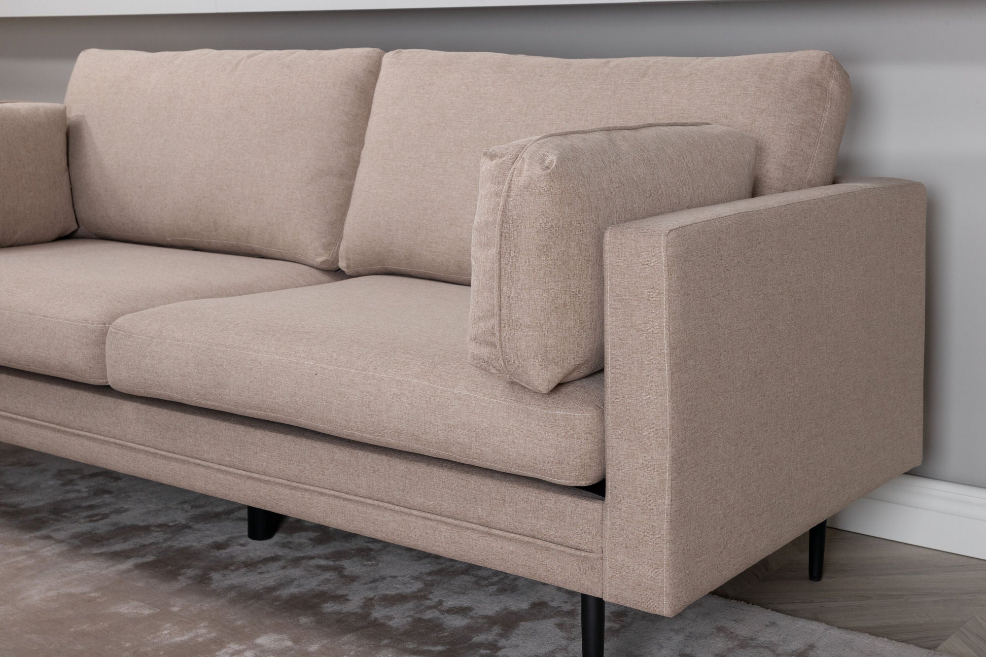 Das Design überzeugt mit klaren Linien, einem eleganten Erscheinungsbild und hohem Sitzkomfort. Die schmalen, schwarzen Metallbeine verleihen dem Sofa Leichtigkeit und setzen zugleich einen modernen Akzent. Durch die großzügige Sitztiefe lädt das Boom Sofa zu langen, entspannten Momenten ein – perfekt für gemütliche Abende allein oder entspannte Stunden zu zweit.