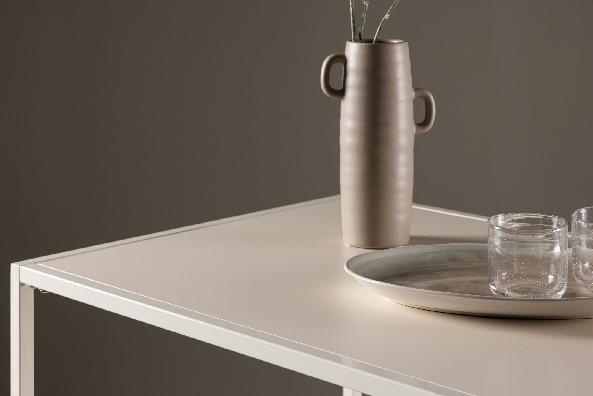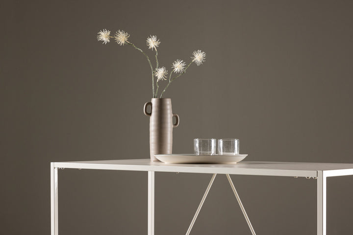 Die Tischplatte aus robustem MDF ist in einem warmen Beige-Ton gehalten und sorgt für eine einladende Atmosphäre. Getragen wird sie von stabilen Stahlbeinen, die dem Tisch nicht nur einen sicheren Stand geben, sondern auch den modernen Charakter unterstreichen.