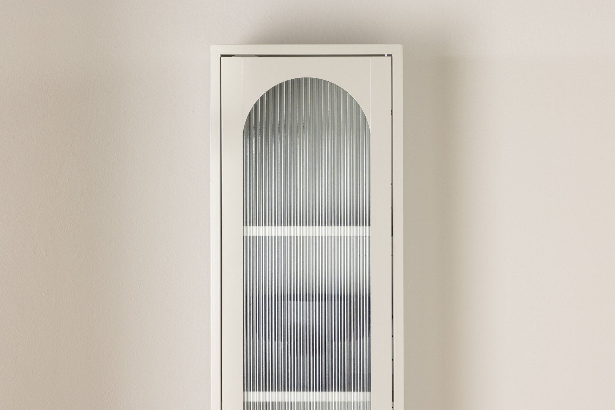 Im Inneren findest du vier großzügige Ablageflächen, die reichlich Stauraum für Ordnung und Struktur bieten. Ein besonderes Highlight ist die Tür aus strukturiertem Wellenglas, die dem Möbelstück eine spannende Tiefe, feine Textur und eine elegante optische Dimension verleiht.