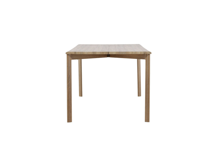 Die Tischplatte aus MDF mit Furnier ist in Naturfarbe und verleiht dem Tisch eine rustikale, zugleich elegante Optik. Die klaren, nordischen Linien unterstreichen den zeitlosen Charakter des Designs und sorgen dafür, dass Damon sich harmonisch in verschiedene Einrichtungsstile einfügt.
