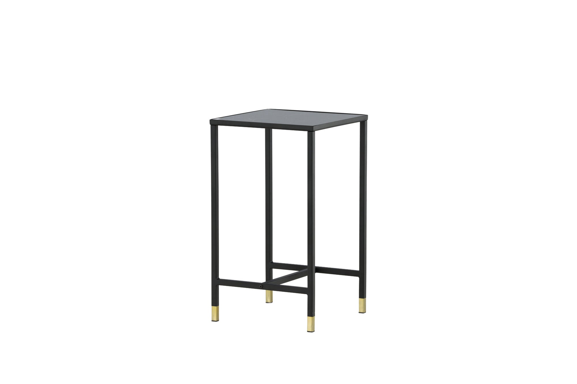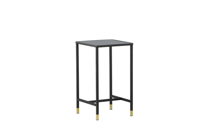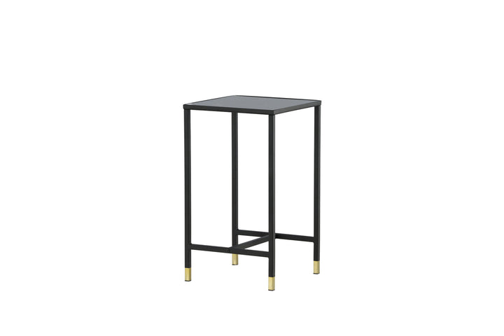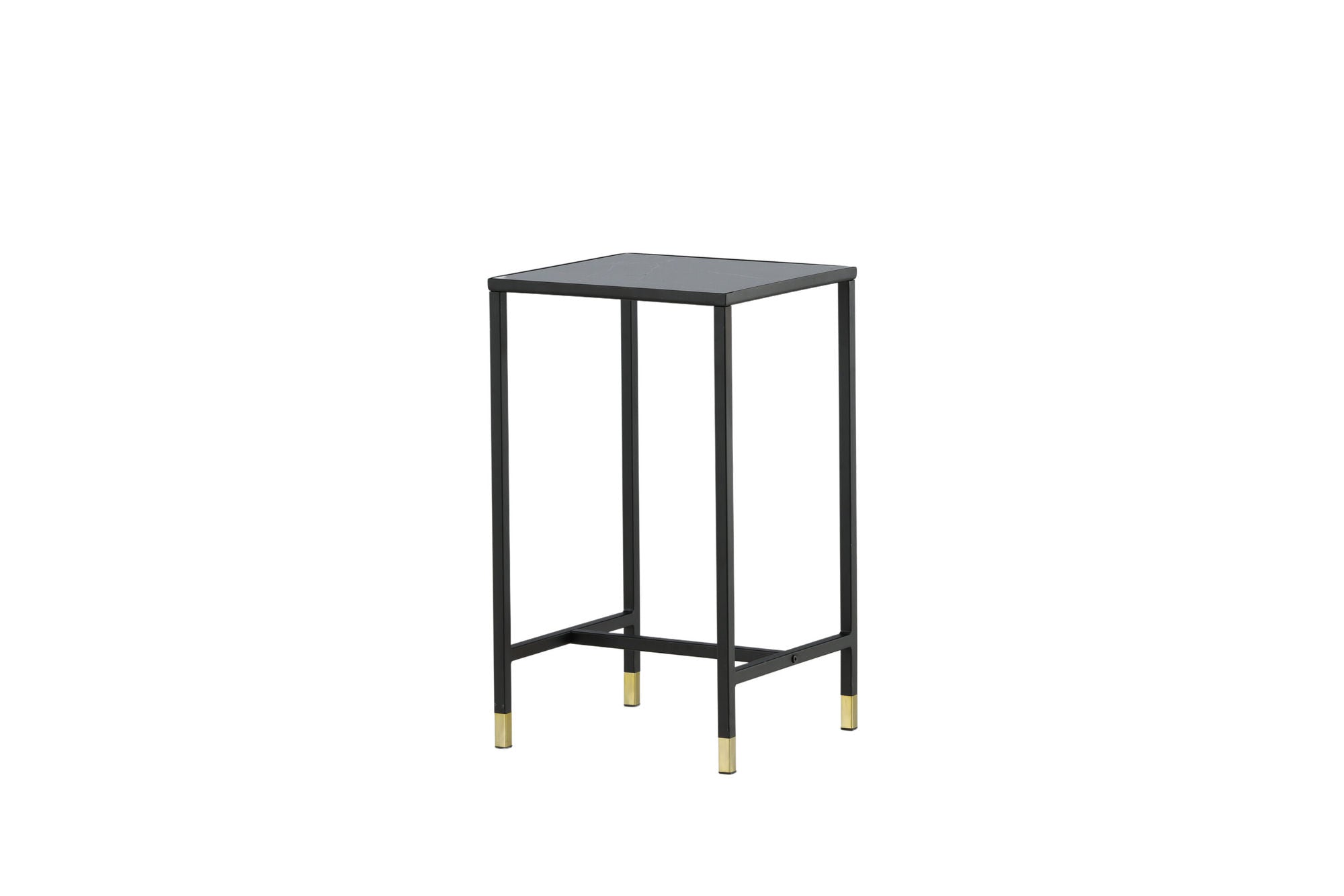 Das hohe, schwarze Stahlgestell sorgt für Stabilität und setzt einen klaren Kontrast zur quadratischen Tischplatte in edler Schwarz-Marmoroptik. Abgerundet wird das Design durch goldfarbene Metallenden, die dem Tisch eine luxuriöse Note verleihen.