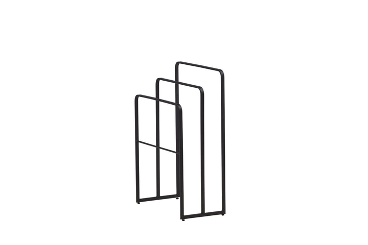 Die schlanke Konstruktion aus schwarzem Metall überzeugt mit einem minimalistischen Look und ist mit drei praktischen Bögen für vielfältige Aufhängungsmöglichkeiten ausgestattet.