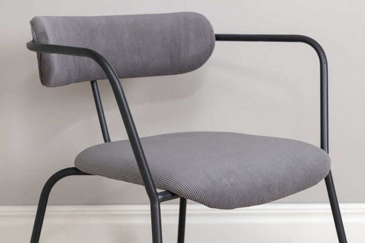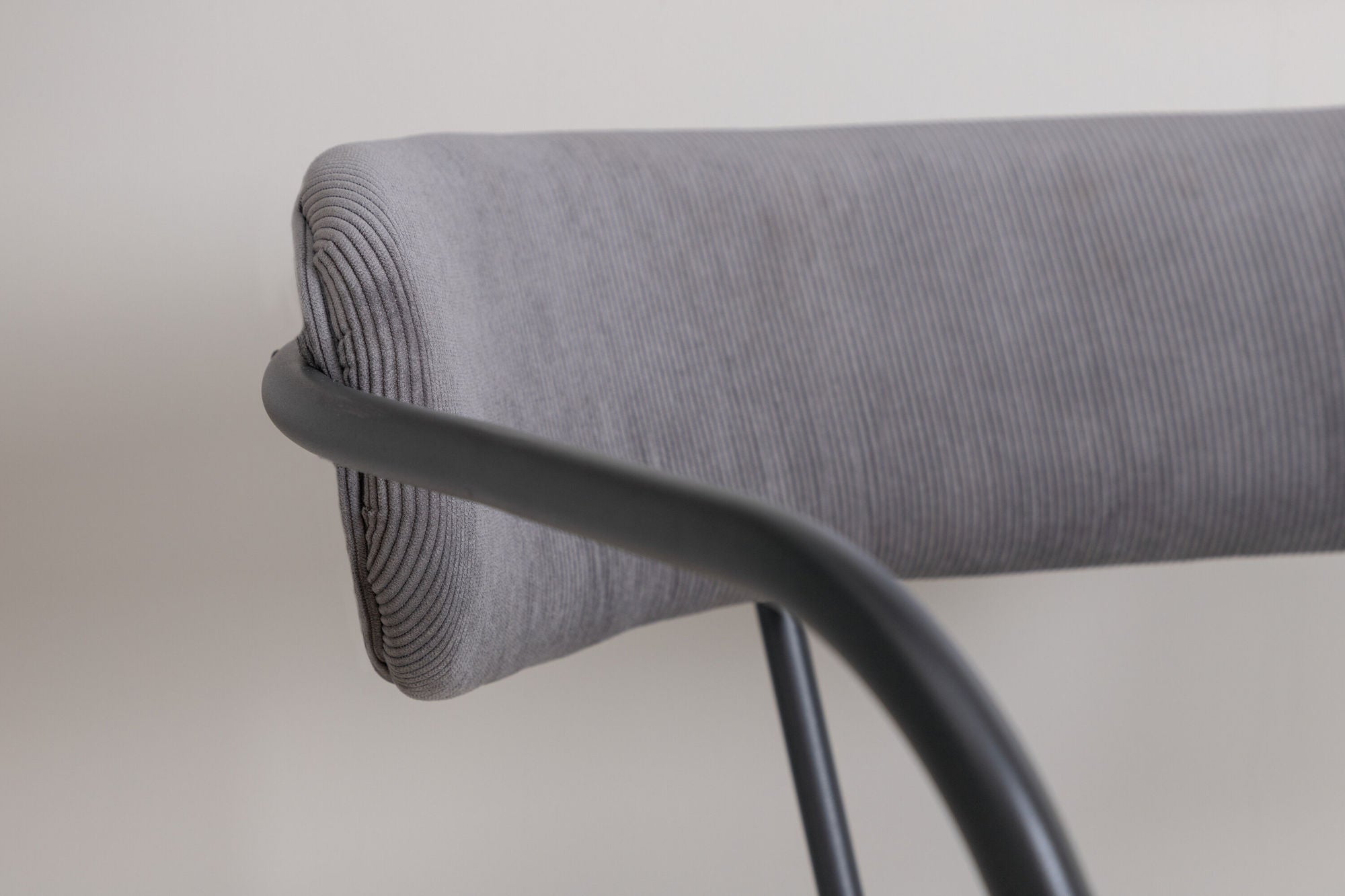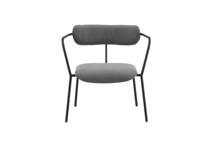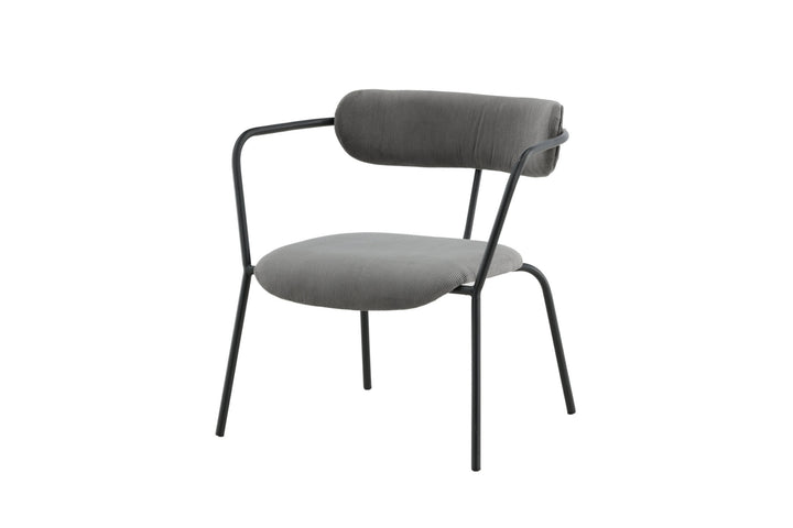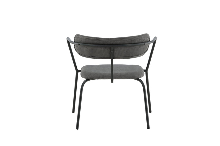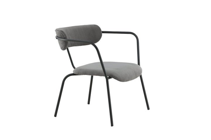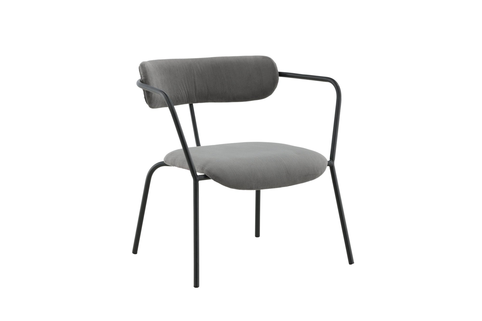 Die Sitzfläche und Rückenlehne sind in grauem Cordstoff gepolstert, der durch seine markante Struktur und weiche Haptik sowohl optisch als auch funktional überzeugt. Die sanft abgerundete Rückenlehne sorgt für zusätzlichen Komfort und macht den Duffy Sessel zu einem gemütlichen Rückzugsort.