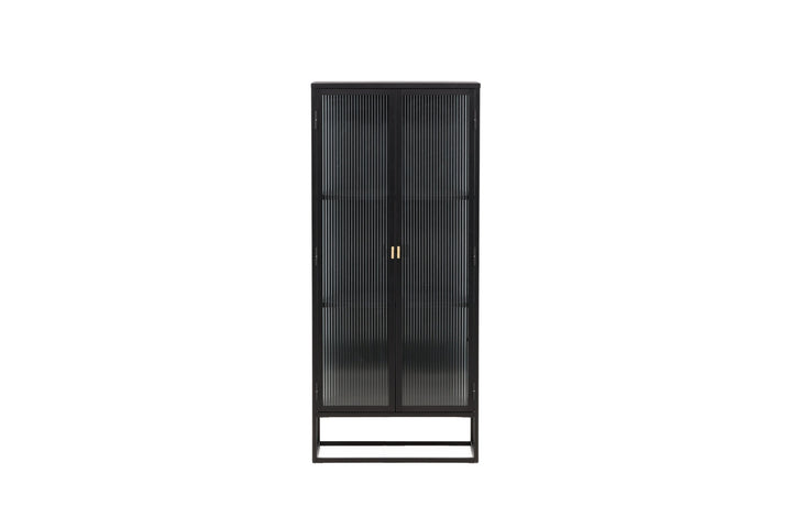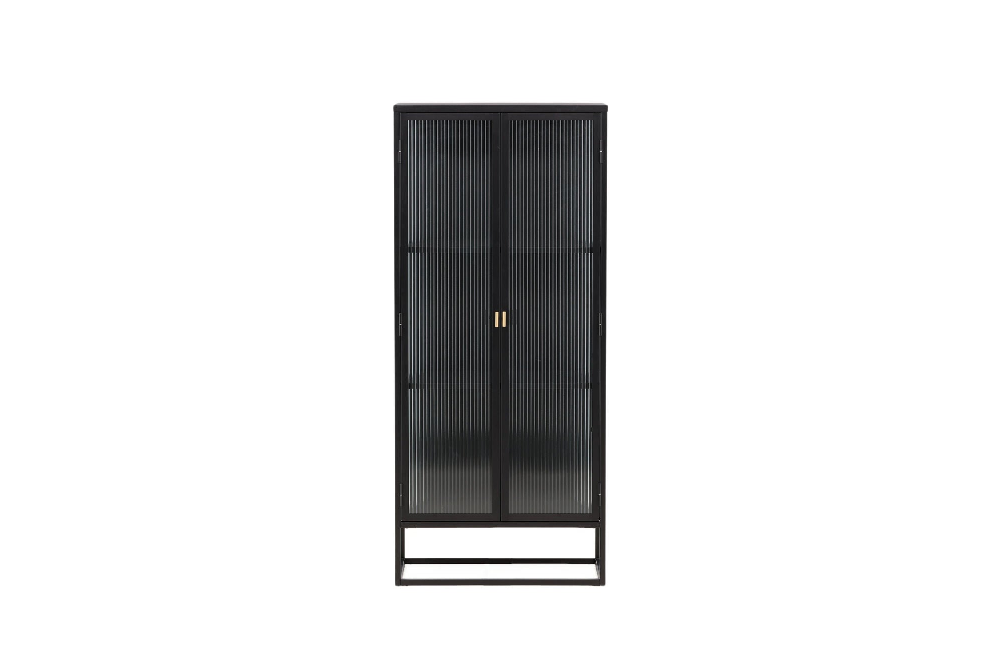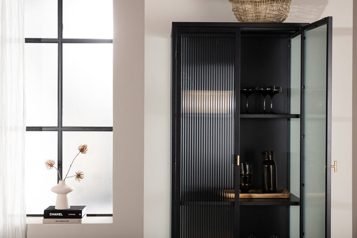 Stilvoll und funktional zugleich – das Highboard Garis ist ein eleganter Blickfang für dein Zuhause. Mit seinen zwei hohen Glastüren im gefalteten Design und dem Rahmen aus schwarz pulverbeschichtetem Stahl verbindet es zeitlose Ästhetik mit moderner Leichtigkeit.
