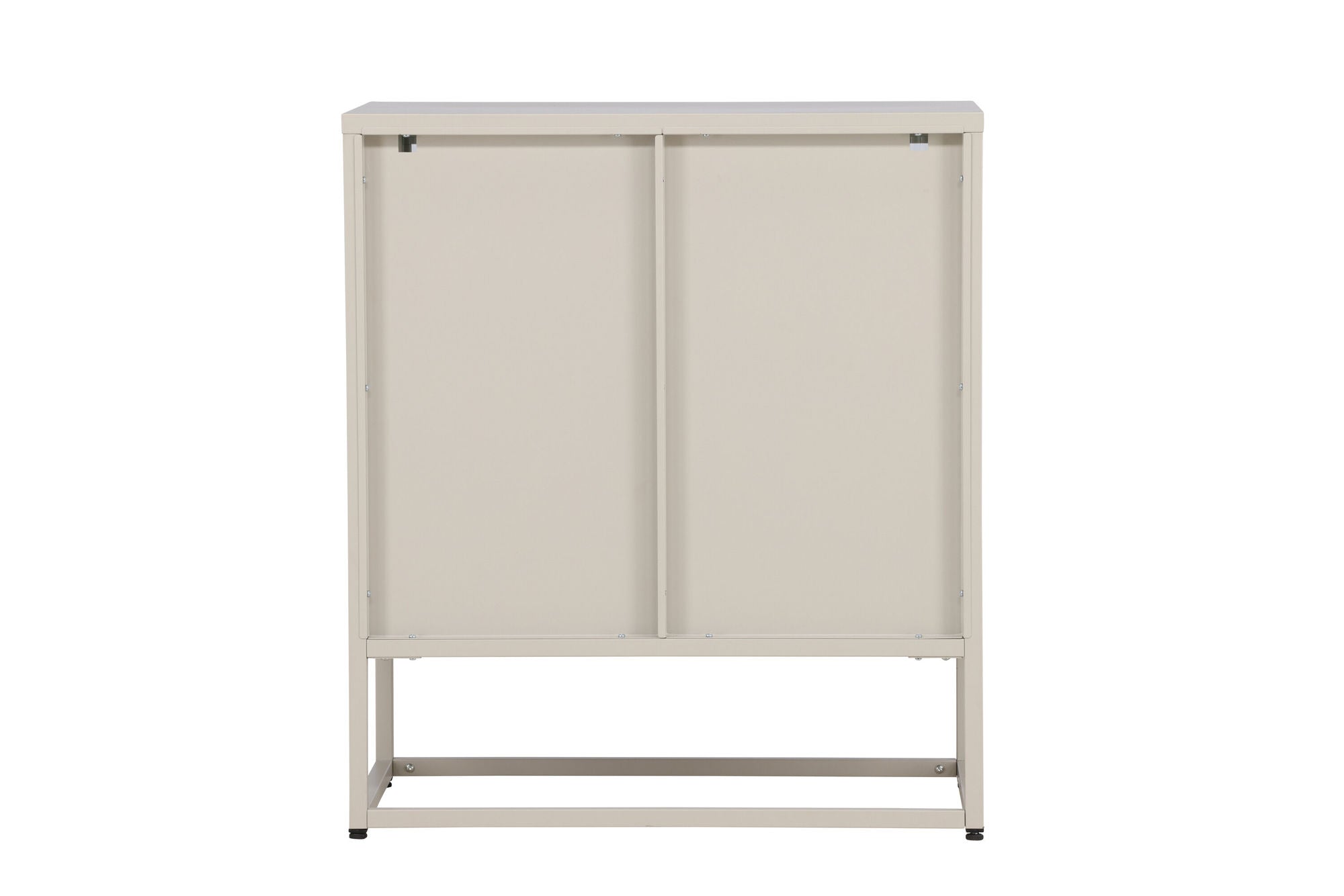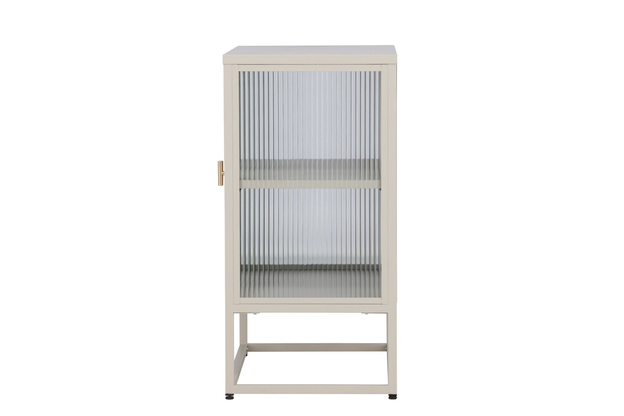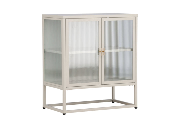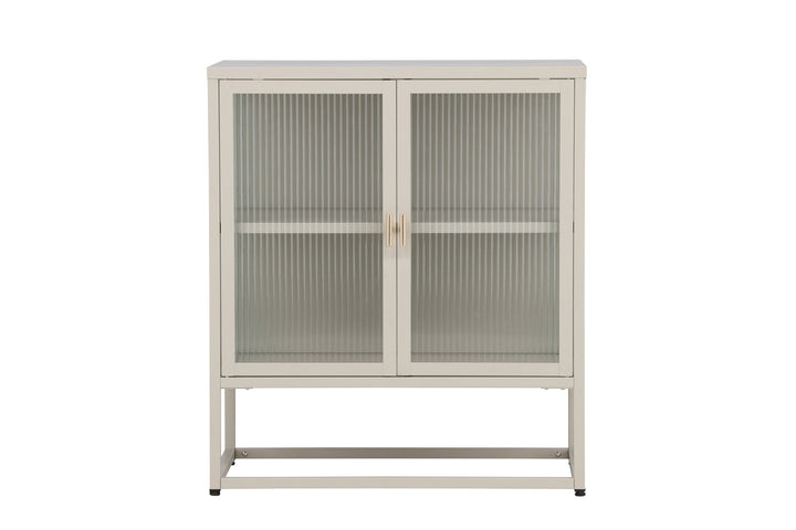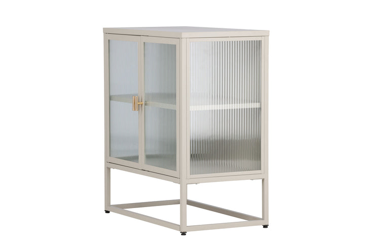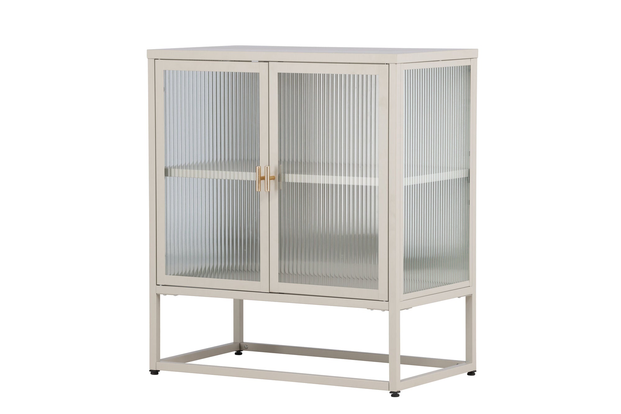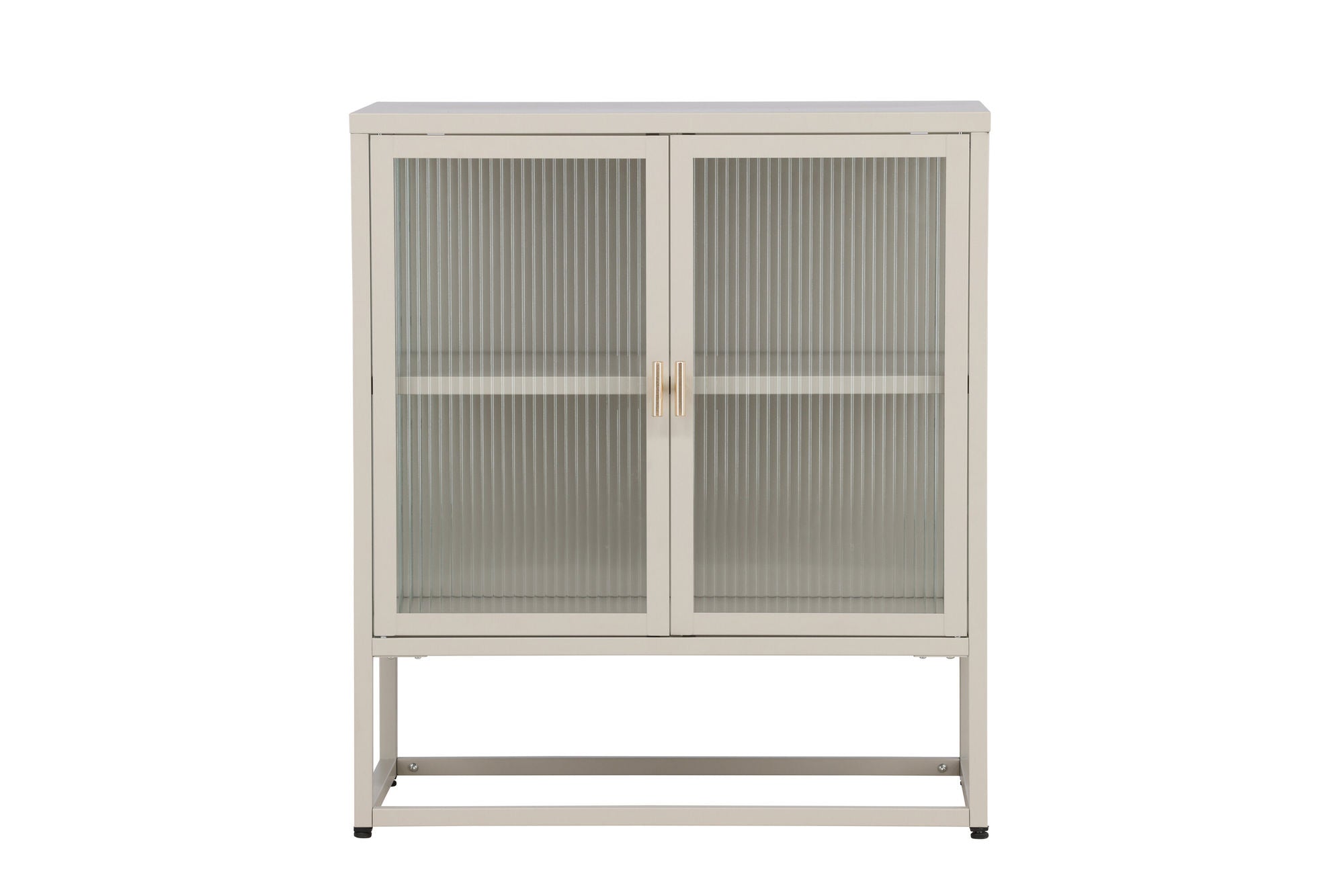 Dieses schlanke Lowboard in einem sanften Beige-Ton fügt sich harmonisch in Wohnzimmer, Flur oder Küche ein. Die beiden Glastüren geben Einblick ins Innere, während die leicht strukturierte Oberfläche des Glases für eine dezente und elegante Ausstrahlung sorgt.