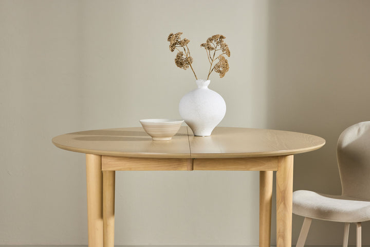 Der runde Esstisch Gilda vereint stilvolles Design mit praktischer Funktionalität. Mit einem Durchmesser von 110 cm ist er die perfekte Wahl für kompakte Essbereiche, kann aber dank der integrierten Auszugsfunktion um 40 cm erweitert werden – ideal, wenn Gäste zu Besuch sind.