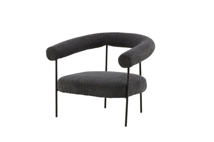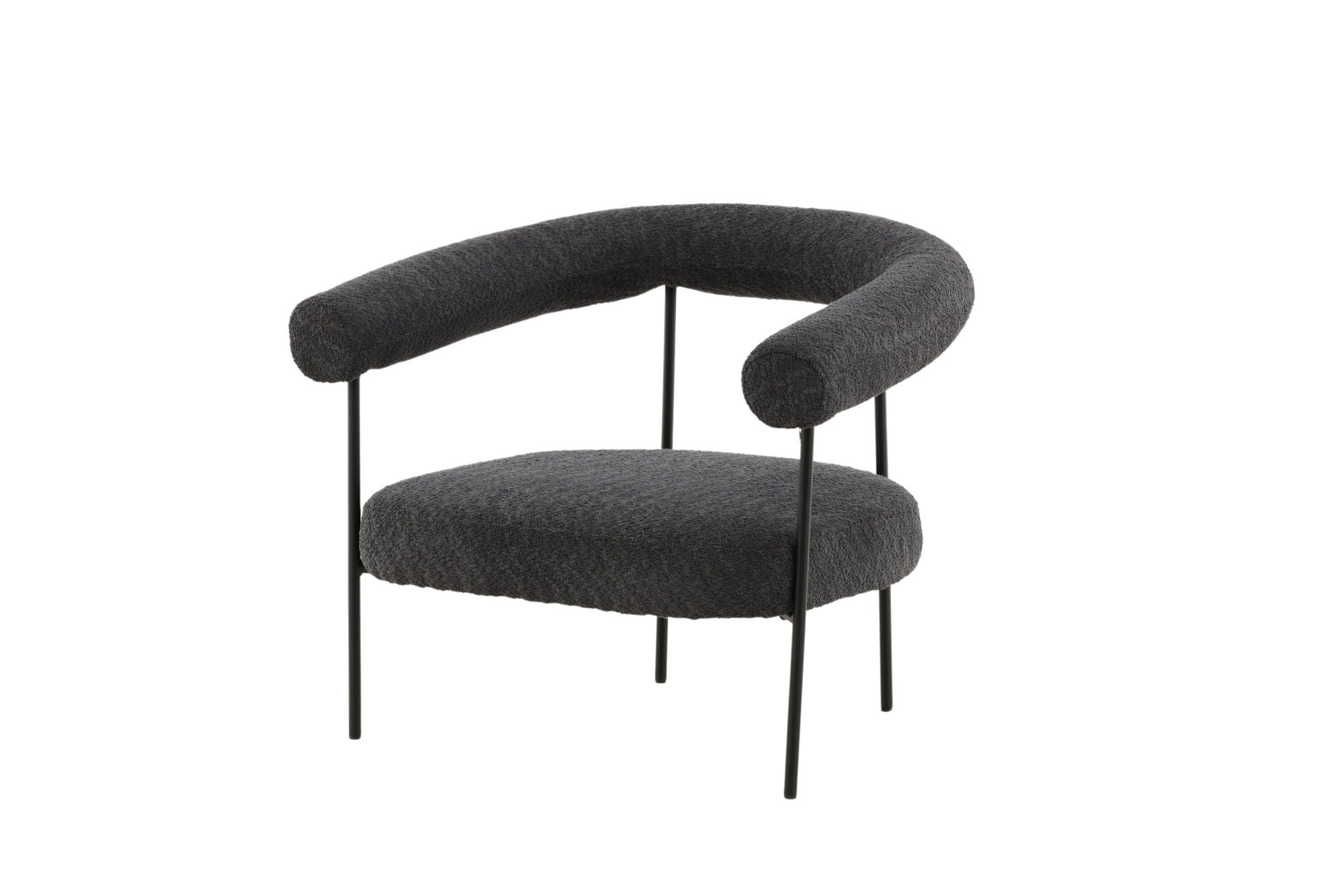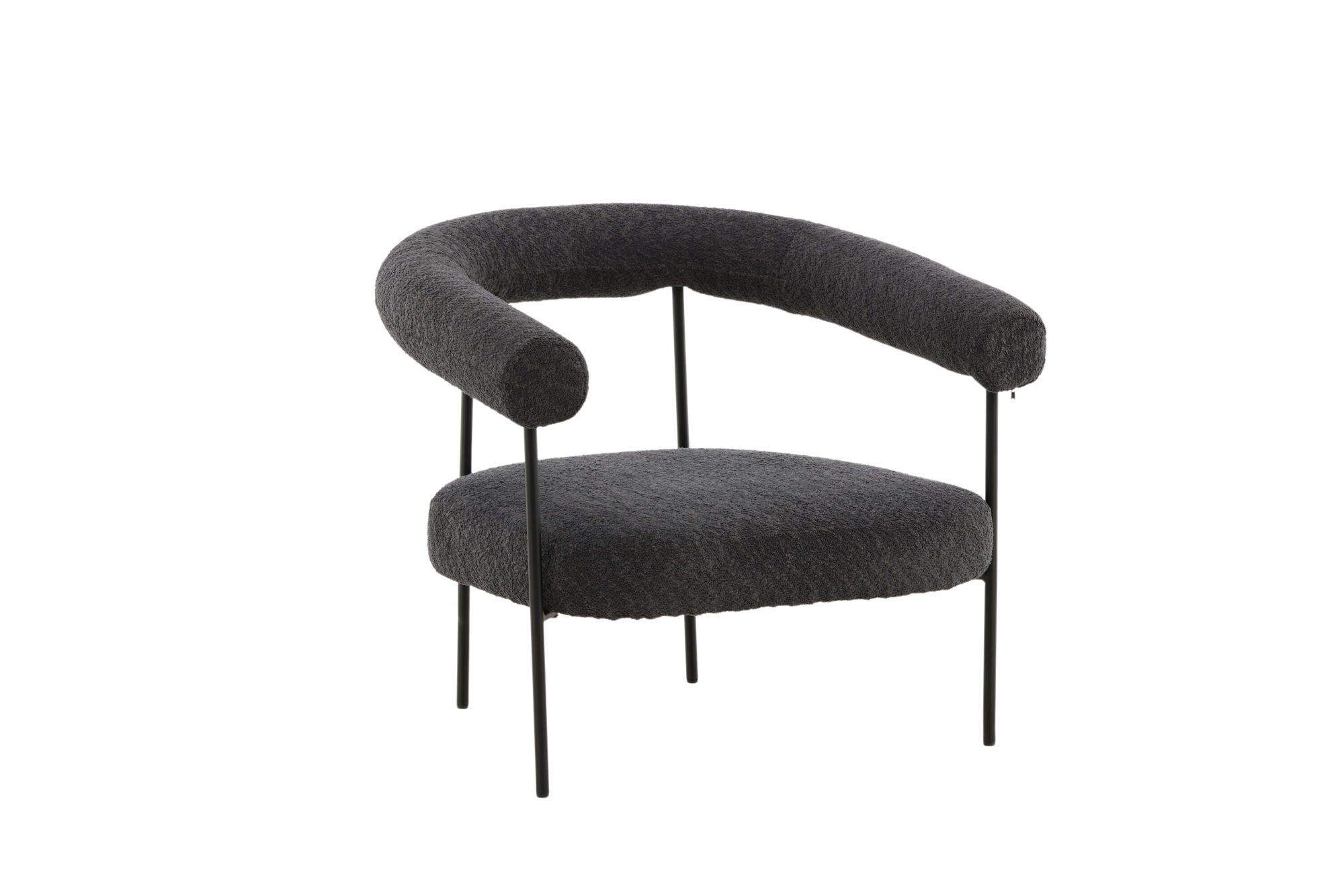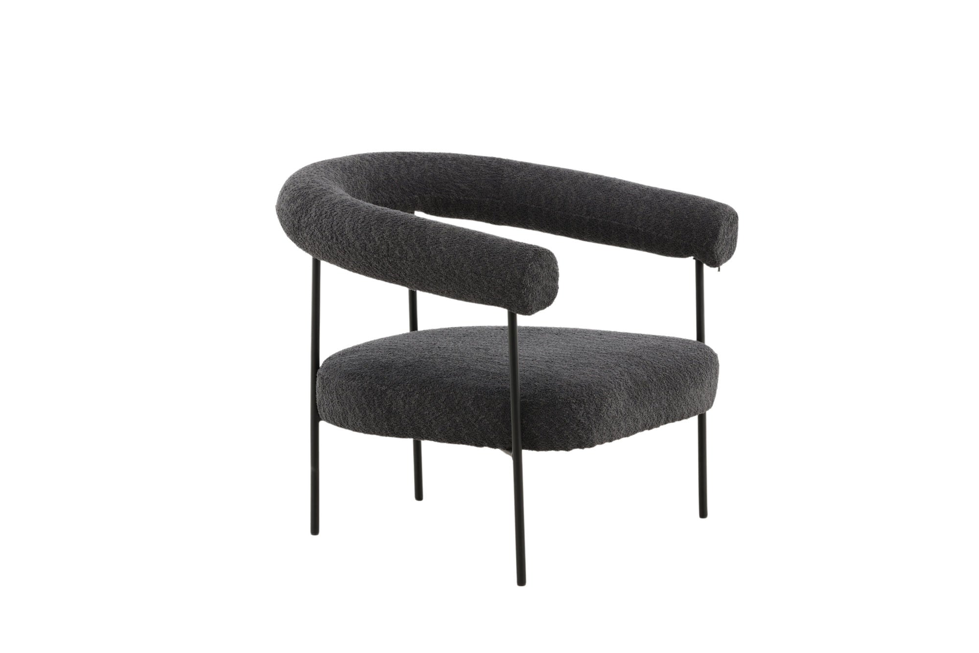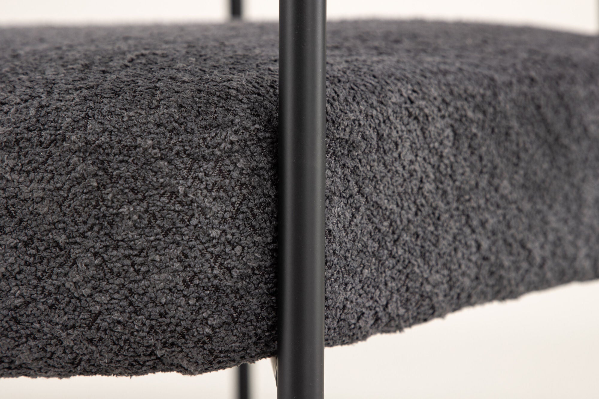 Das besondere Halbmond-Design mit seiner großzügigen Sitzfläche lädt zum Verweilen ein und bietet höchsten Komfort. Der Bezug aus trendigem Bouclé-Stoff in Dunkelgrau sorgt für eine moderne Textur, die sich stilvoll in unterschiedliche Wohnstile einfügt. Ergänzt wird das Design durch das minimalistische Gestell aus schwarzem Stahl, das Leichtigkeit und Stabilität perfekt vereint.