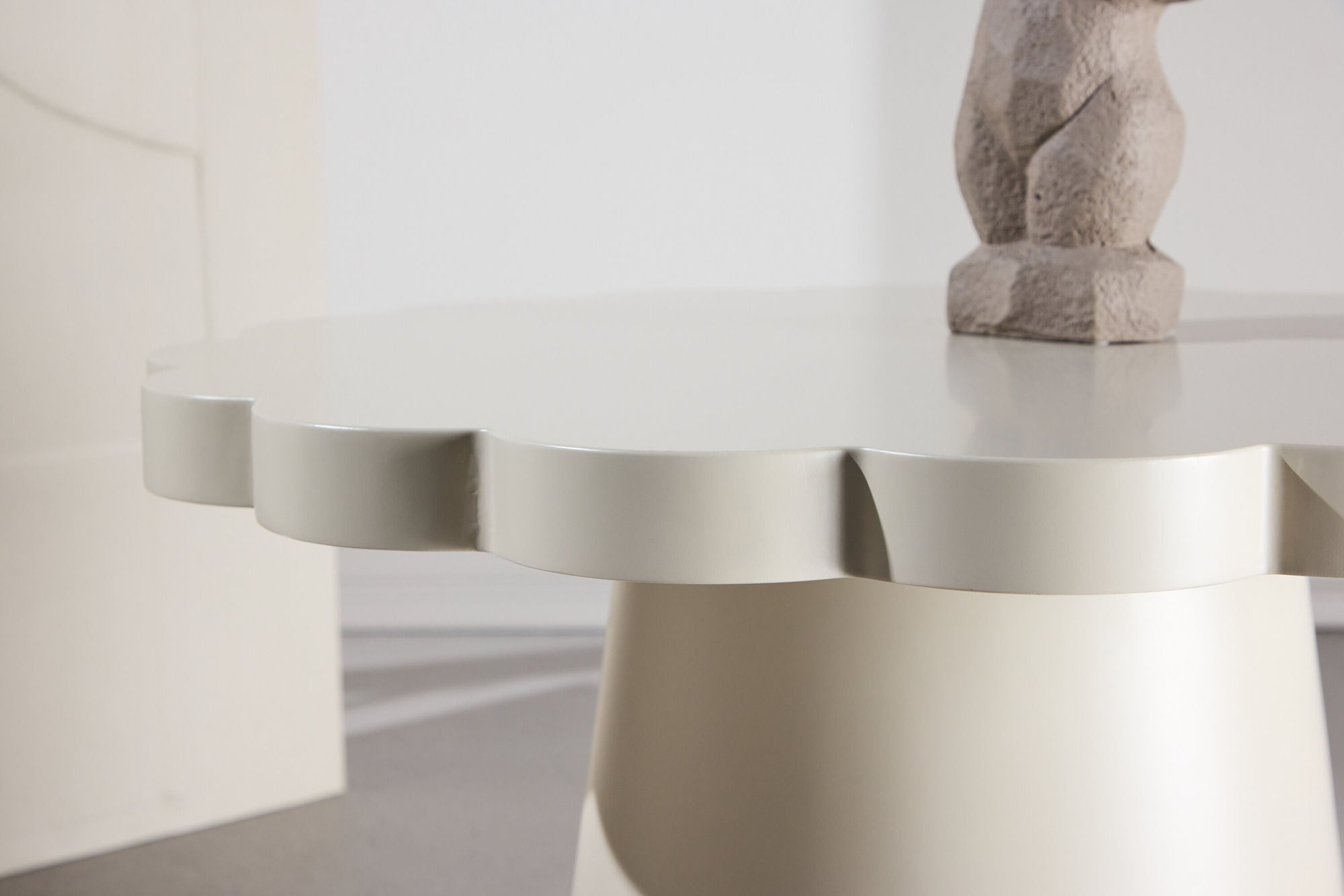 Die Tischplatte begeistert mit einem dekorativen Wellenrand, der dem klaren Design eine verspielte Note verleiht. Das zylindrische Tischbein sorgt für Stabilität und unterstreicht den modernen Charakter. Dank der dezenten beigen Farbgebung lässt sich der Krull mühelos mit verschiedenen Einrichtungsstilen kombinieren.