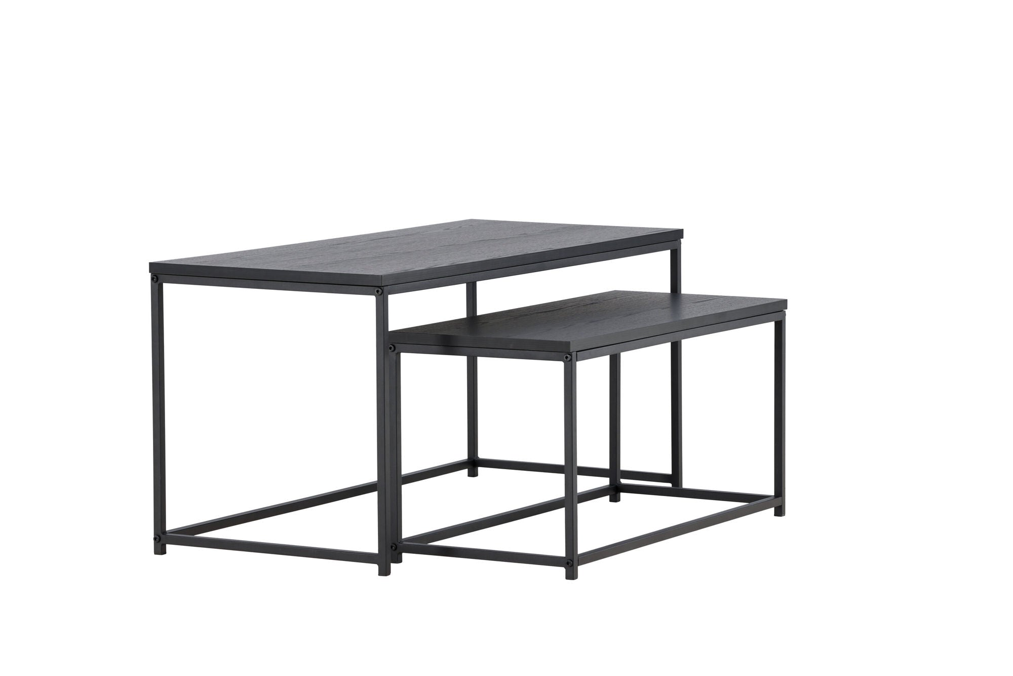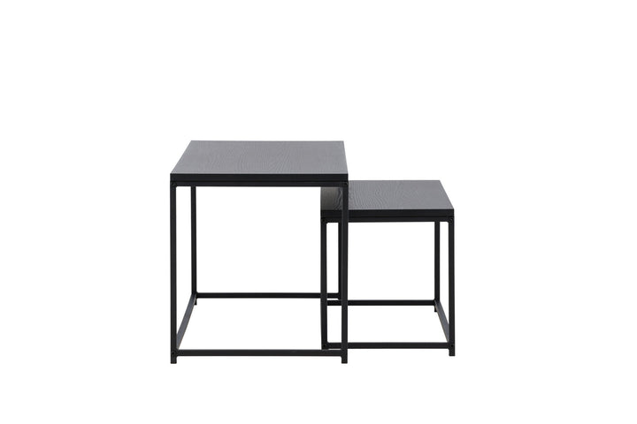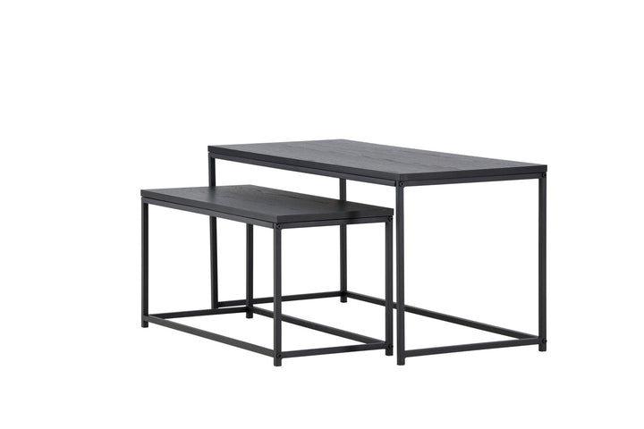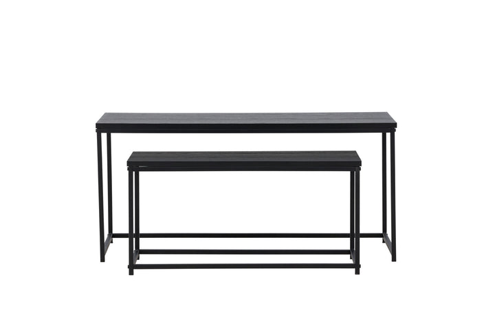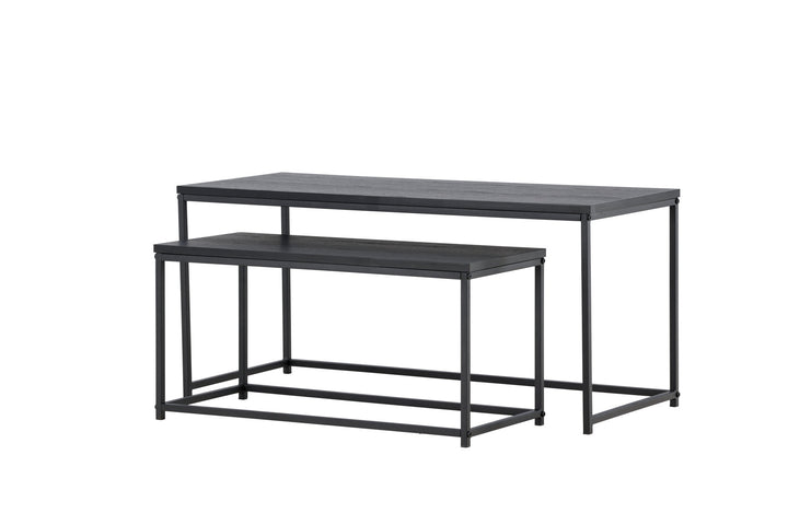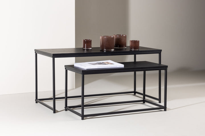 Die schwarzen MDF-Tischplatten in Kombination mit den Stahlbeinen sorgen für einen stilvollen Kontrast und machen das Set zu einem echten Hingucker. Die durchdachte Gestaltung vereint Funktionalität mit nordischer Eleganz und bringt damit zeitgemäßen Stil in Ihr Zuhause.