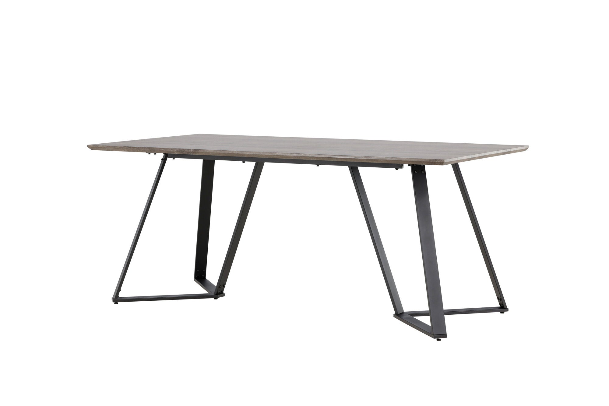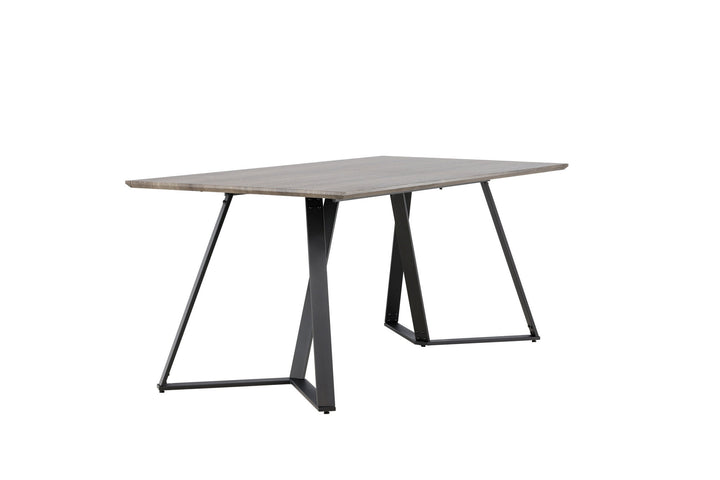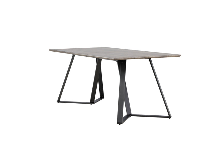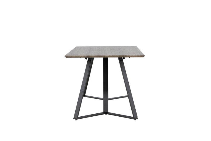 Der rechteckige Esstisch Marina kombiniert modernes Design mit zeitloser Eleganz. Die Tischplatte aus MDF in grauer Eichenoptik bringt eine warme, erdige Note in den Raum, während die schwarzen Metallbeine für Stabilität und einen dekorativen Akzent sorgen.