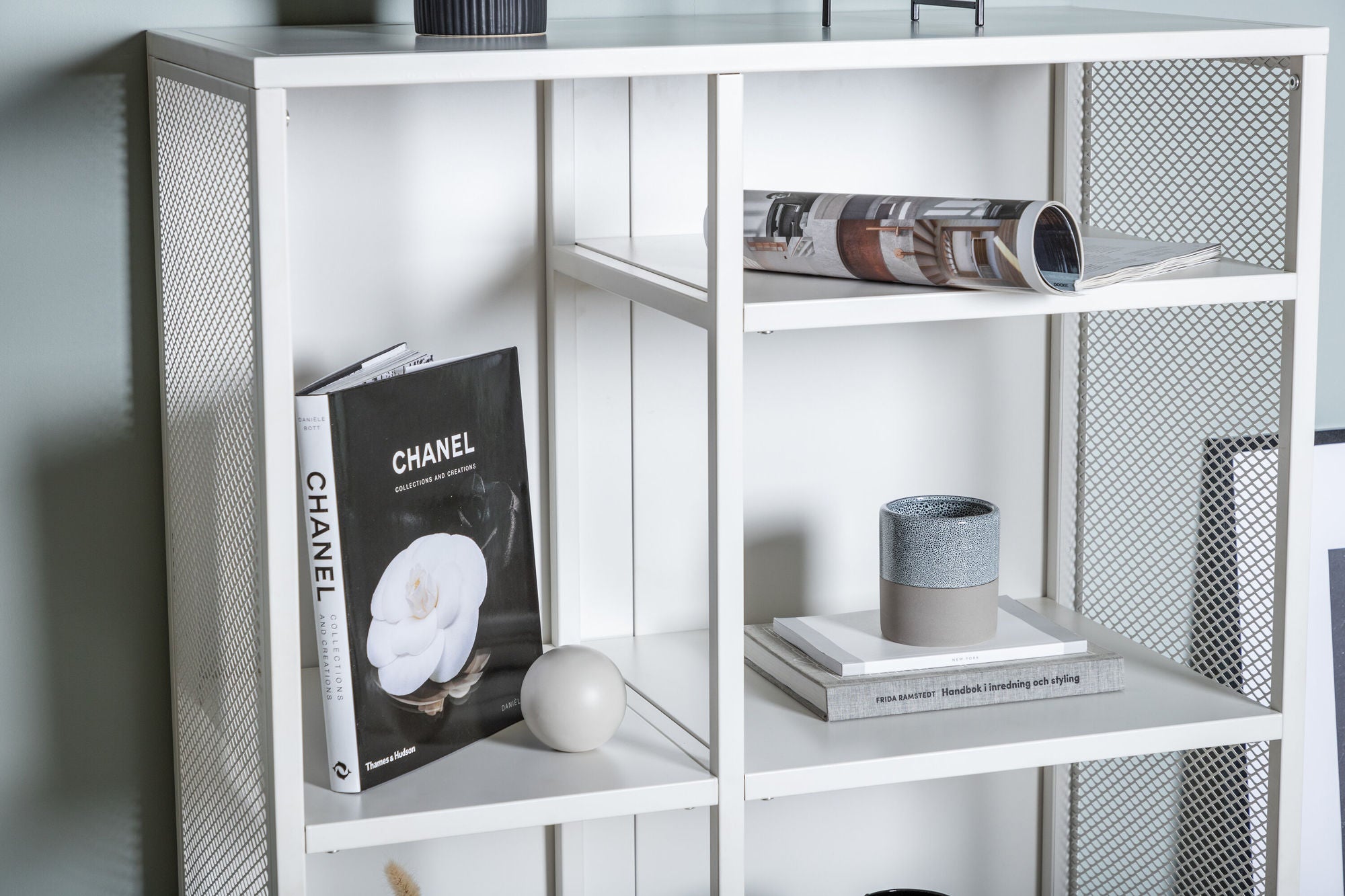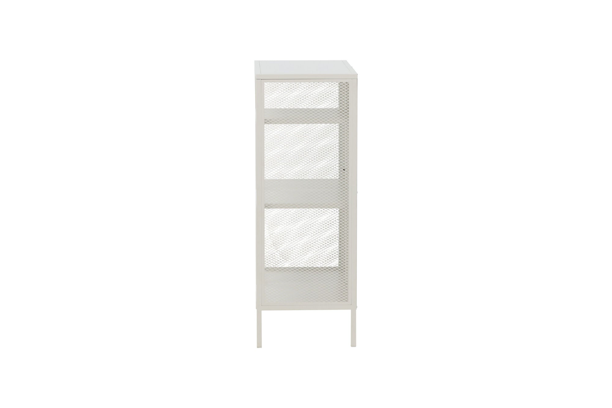 Die Netz-Seitenwände verleihen dem Regal nicht nur Stabilität, sondern setzen auch einen markanten Design-Akzent, der perfekt zu modernen Loft- oder Skandi-Interieurs passt. Getragen von vier stabilen Stahlbeinen, ist das Regal langlebig und standfest.