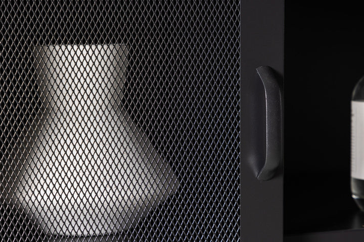 Besonders markant sind die Türen aus fein perforiertem Stahlgitter: Sie verbergen den Inhalt, lassen aber gleichzeitig Silhouetten und Konturen erahnen. Dieses subtile Spiel aus Licht und Schatten sorgt nicht nur für eine spannende Optik, sondern bietet auch eine natürliche Belüftung des Schrankinneren.