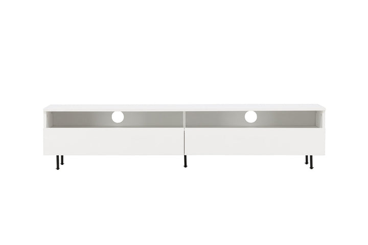 Zwei großzügige Schubladen bieten dir verdeckten Stauraum für Fernbedienungen, Kabel oder Bücher, während die offenen Fächer darüber Platz für häufig genutzte Geräte oder dekorative Objekte schaffen. Die breite Oberplatte lädt dazu ein, dein Wohnzimmer mit Kerzenhaltern, Pflanzen oder Lautsprechern stilvoll abzurunden.
