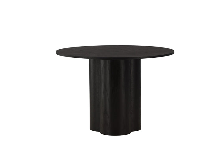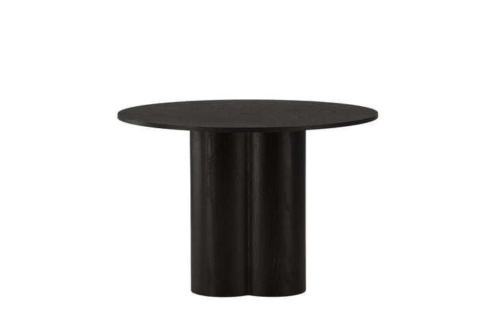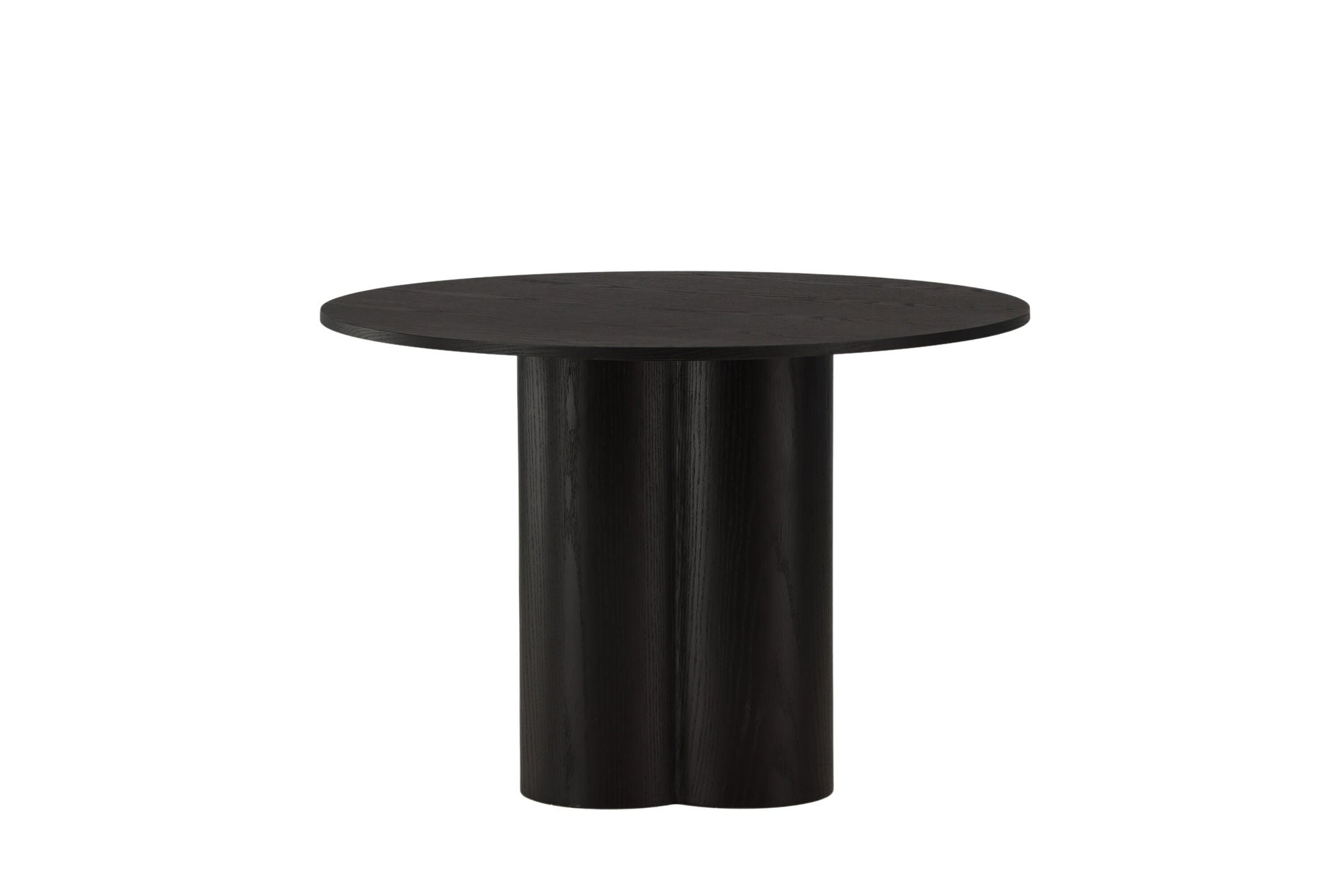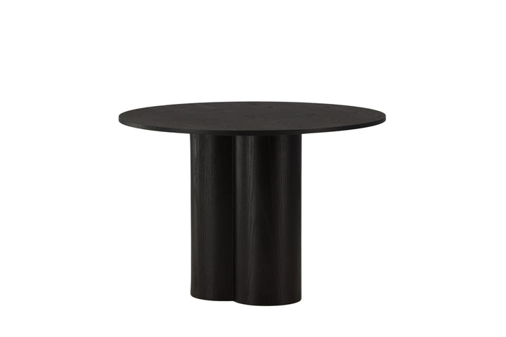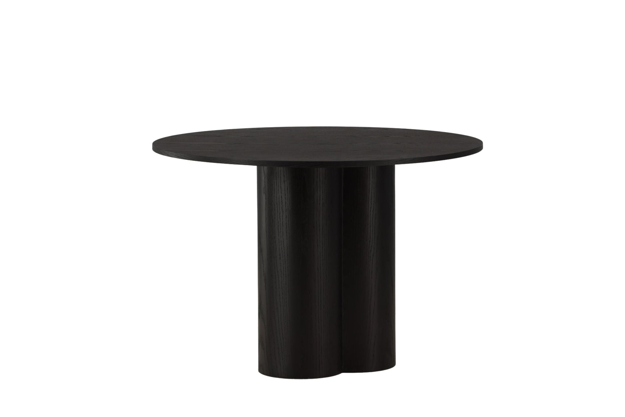 Die runde Tischplatte aus schwarz furniertem MDF wird von drei zylindrischen Beinen getragen, die mittig angeordnet sind und für eine harmonische Optik sowie hohe Stabilität sorgen. Durch die dezente Maserung des Furniers erhält die Oberfläche eine lebendige Struktur, die dem Tisch zusätzlichen Charakter verleiht.
