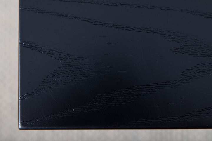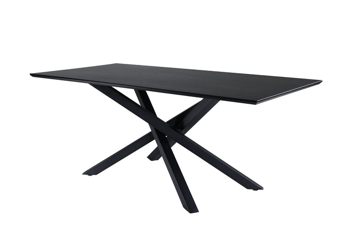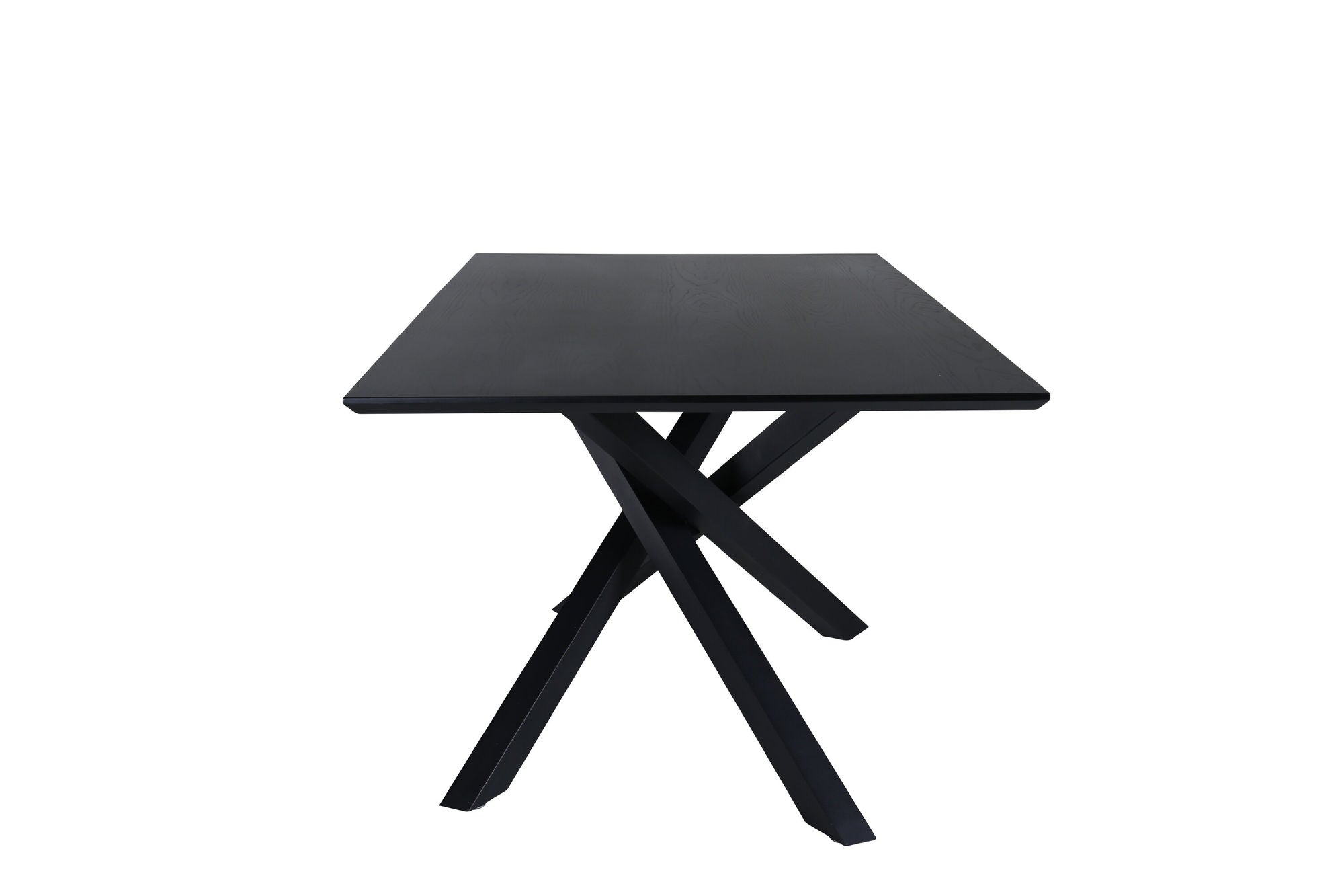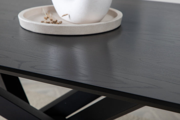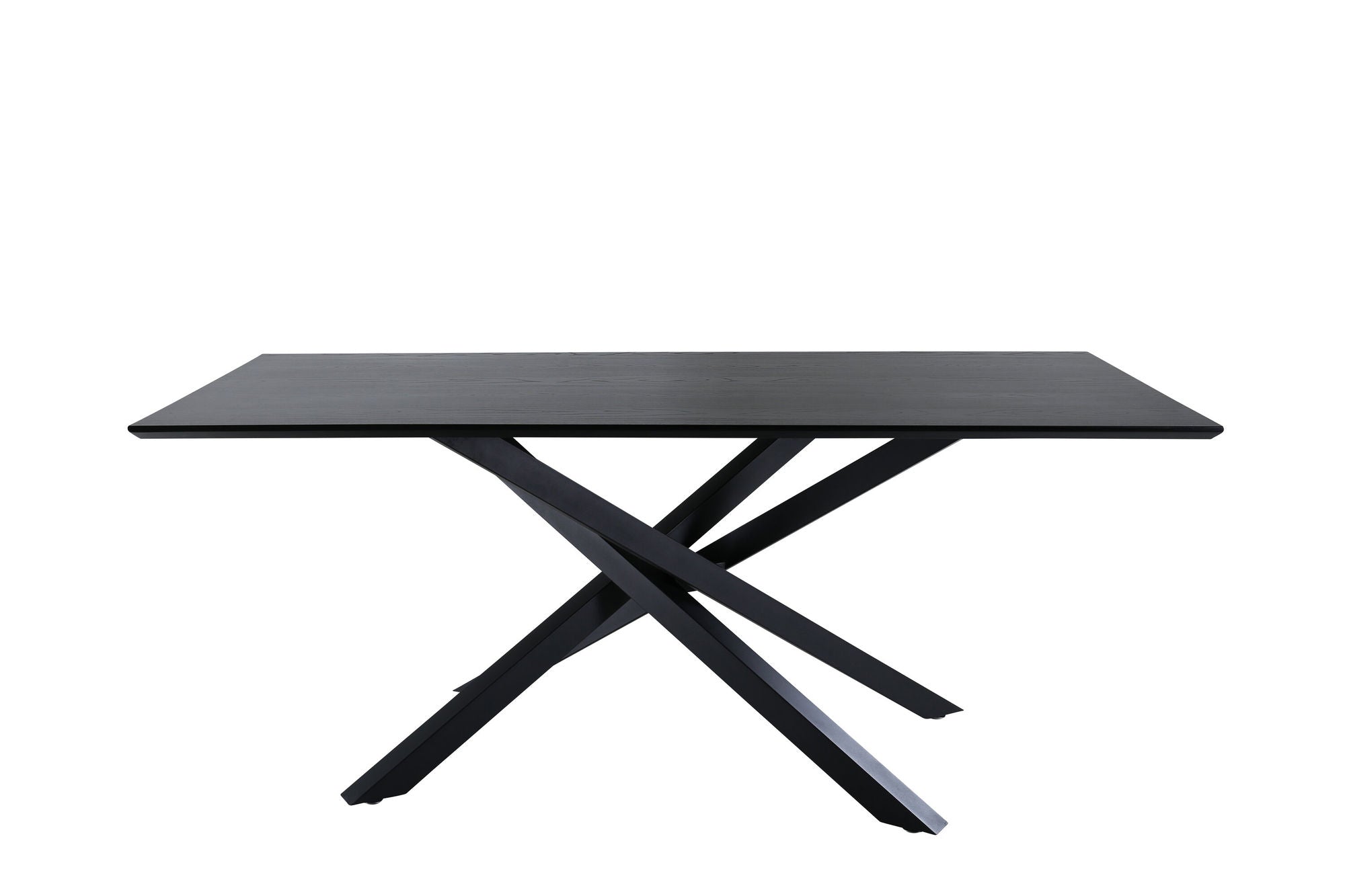 Die Tischplatte aus schwarzem MDF-Furnier verleiht dem Tisch eine edle Ausstrahlung, während die markanten Kreuzbeine aus schwarzem Eisen für Stabilität sorgen und gleichzeitig ein stilvolles Design-Detail darstellen. So entsteht ein harmonisches Zusammenspiel aus Eleganz und industriellem Charakter.