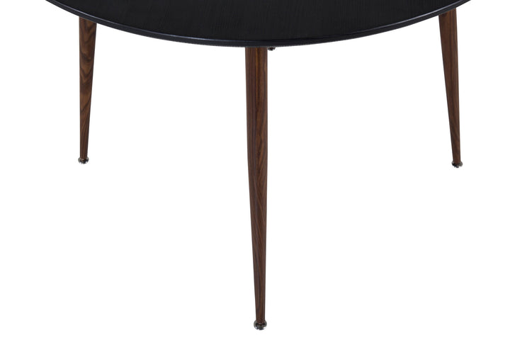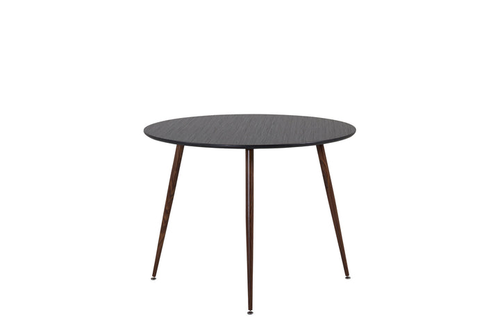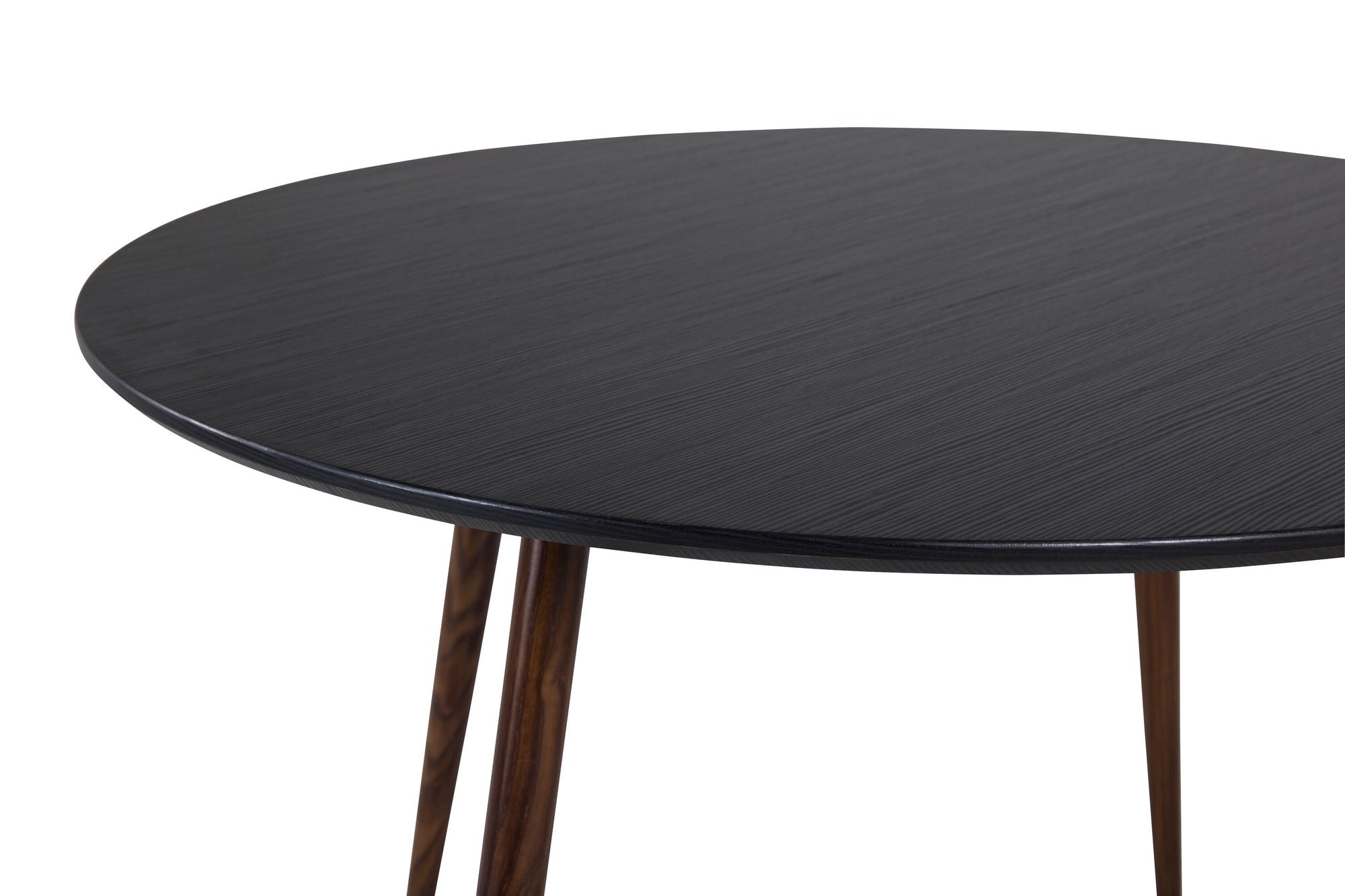 Der runde Esstisch Plaza vereint modernes Design mit wohnlicher Wärme. Die Tischplatte aus schwarzem MDF bildet einen stilvollen Kontrast zu den leicht ausgestellten Beinen in edler Walnussoptik.