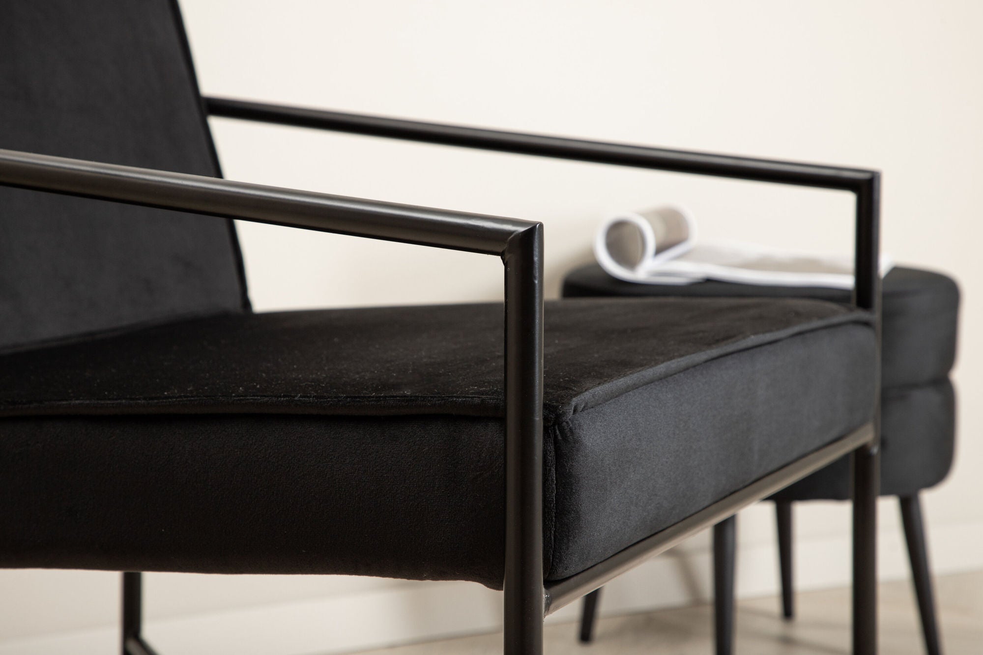 Der Rakel Sessel vereint skandinavischen Minimalismus mit zeitloser Eleganz und wird so zum stilvollen Highlight in jedem Wohnzimmer. Das filigrane Gestell aus schwarz pulverbeschichtetem Metall sorgt für einen modernen Look, während das hochwertige Samtpolster in tiefem Schwarz Eleganz und Extravaganz verleiht. Die angenehm geneigte Sitzfläche mit optimaler Polsterung bietet dabei maximalen Komfort – perfekt zum Entspannen und Wohlfühlen.