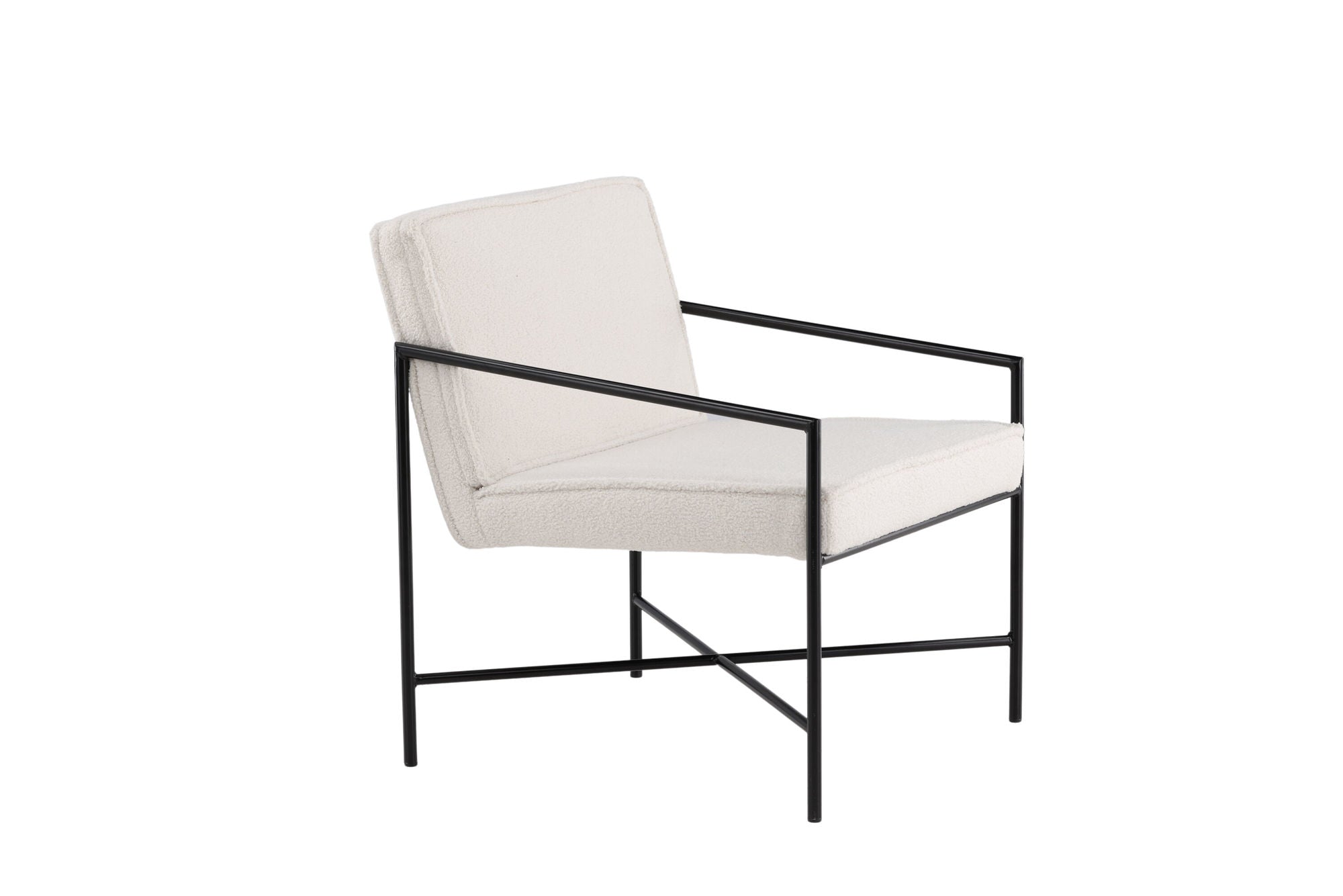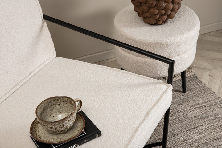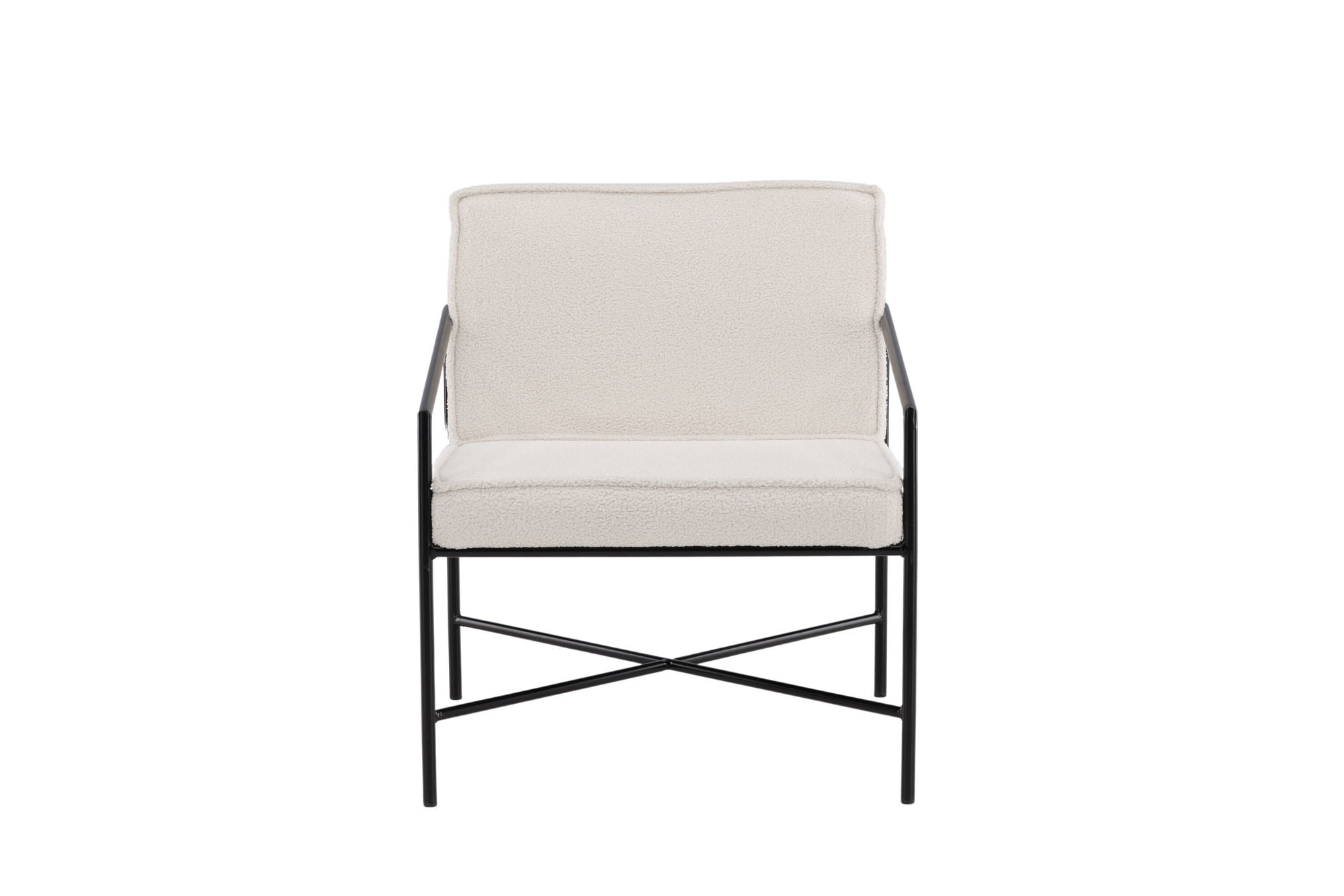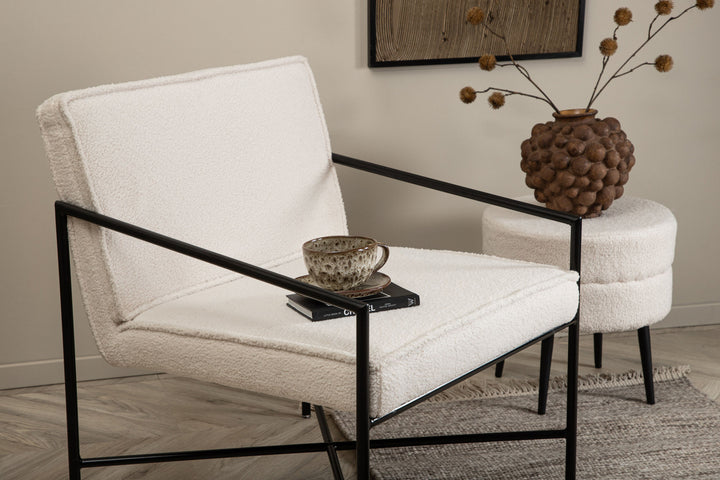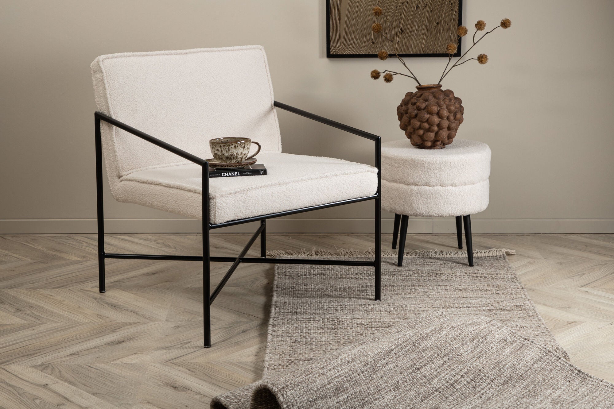 Der Rakel Sessel kombiniert modernes skandinavisches Design mit höchstem Sitzkomfort. Der Bezug aus kuscheligem Teddy-Stoff in Offwhite sorgt für eine warme, einladende Ausstrahlung und macht den Sessel zum perfekten Platz für entspannte Momente. Das schlanke Gestell aus schwarz pulverbeschichtetem Metall verleiht dem Design einen modernen, minimalistischen Charakter und schafft einen stilvollen Kontrast.