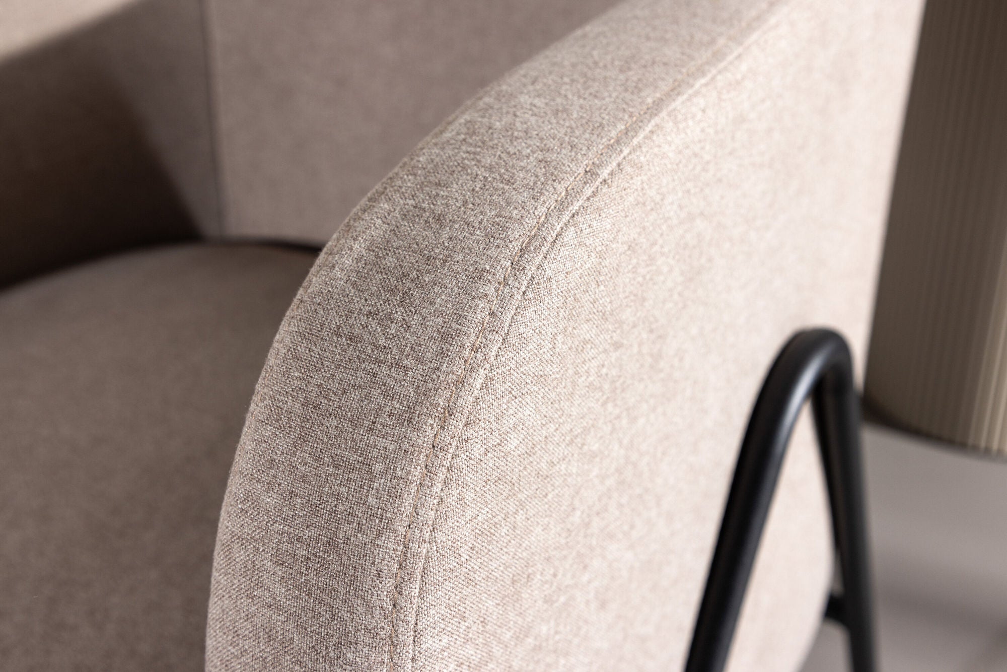 Der Rika Sessel verbindet modernes Design mit zeitloser Eleganz und wird schnell zum Highlight in deinem Zuhause. Das schwarze Metallgestell, das außen am Rahmen angebracht ist, verleiht dem Sessel einen spannenden Kontrast und eine besondere architektonische Note. Der beige Stoffbezug sorgt für eine warme, einladende Atmosphäre und macht Rika zum perfekten Begleiter für gemütliche Stunden.