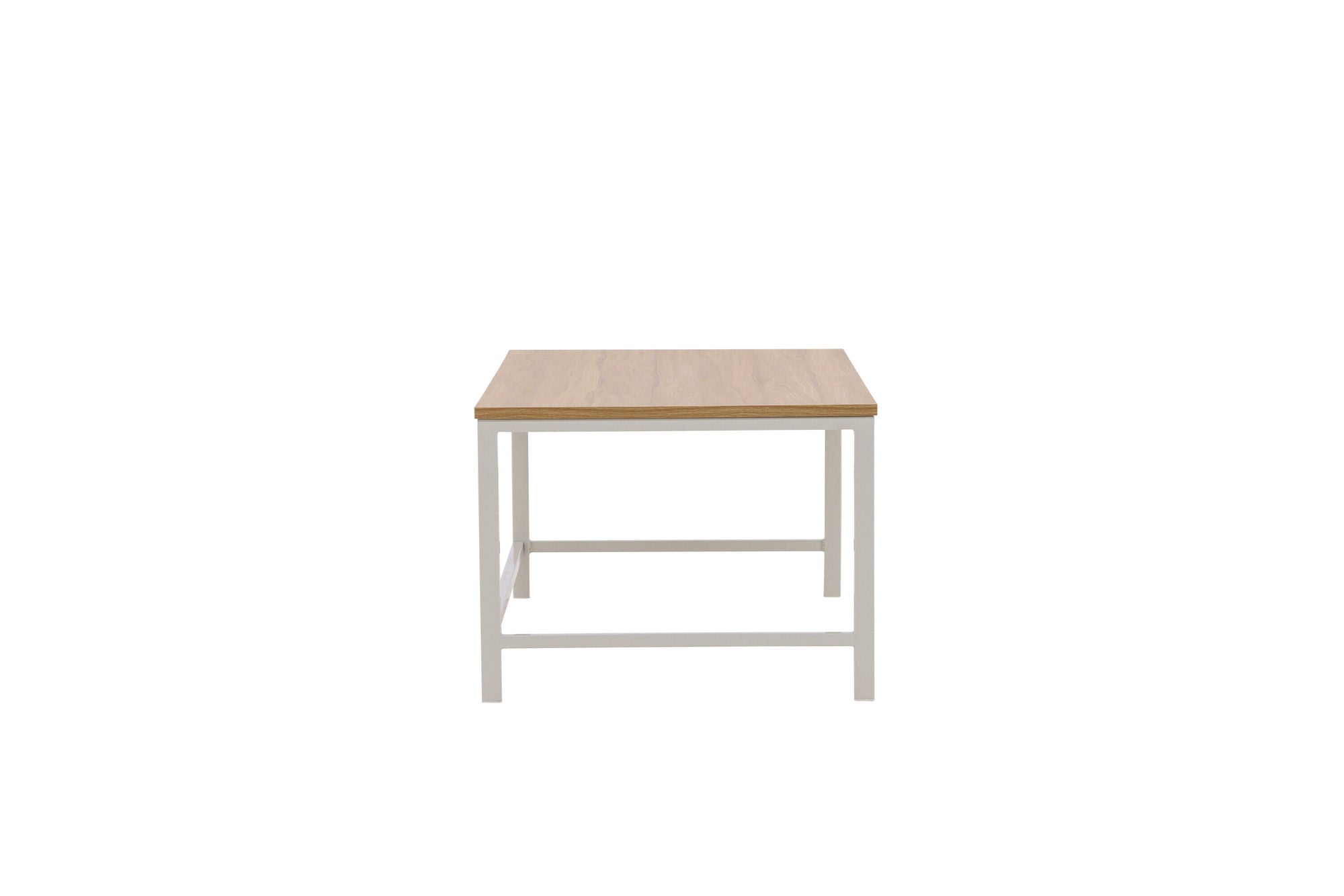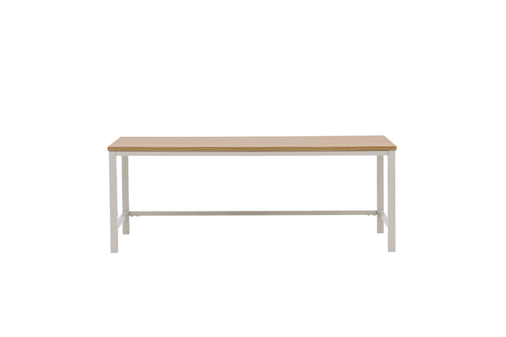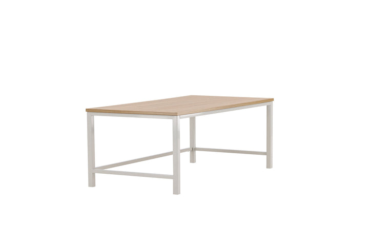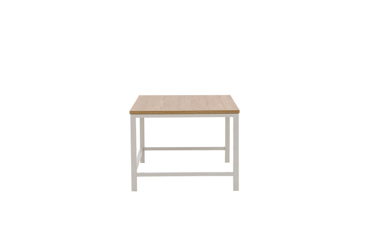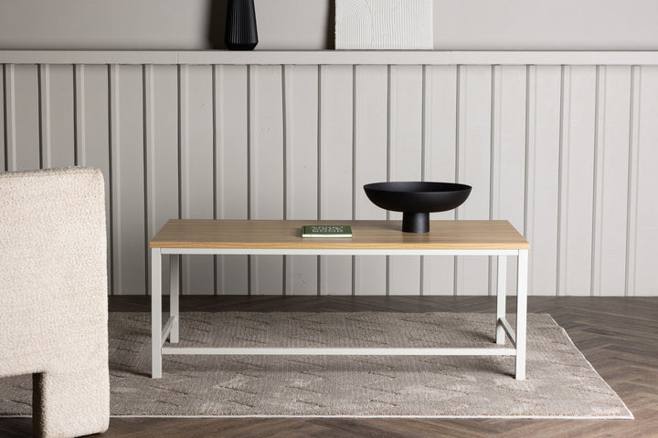 Das robuste Stahlgestell verleiht dem Tisch Stabilität und Langlebigkeit, während die pflegeleichte MDF-Tischplatte in natürlicher Holzoptik für eine einladende Wohnatmosphäre sorgt.