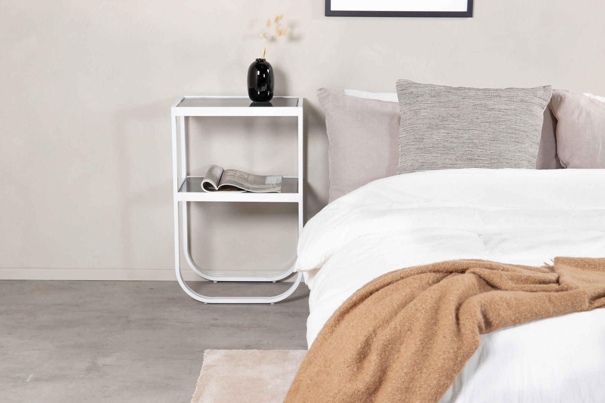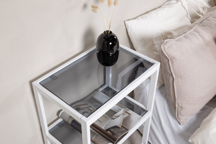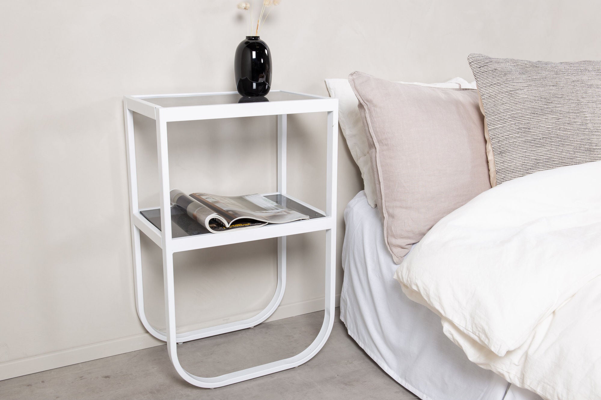 Der Rocker Nachttisch vereint modernes Design mit einem Hauch von Eleganz. Mit seinem schlanken weißen Gestell und der edlen Ablagefläche aus grauem Rauchglas wird er zum stilvollen Blickfang in jedem Schlafzimmer.