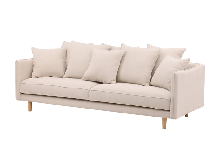Die schmalen Beine aus Kiefernholz verleihen dem 3-Sitzer Sofa nicht nur eine stilvolle Leichtigkeit, sondern ermöglichen auch eine einfache Reinigung darunter. Mehrere dekorative Kissen schmücken die Rückenlehne und sorgen für ein trendbewusstes Erscheinungsbild sowie optimalen Sitzkomfort.