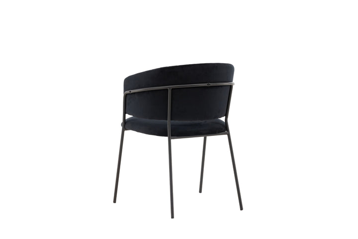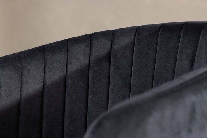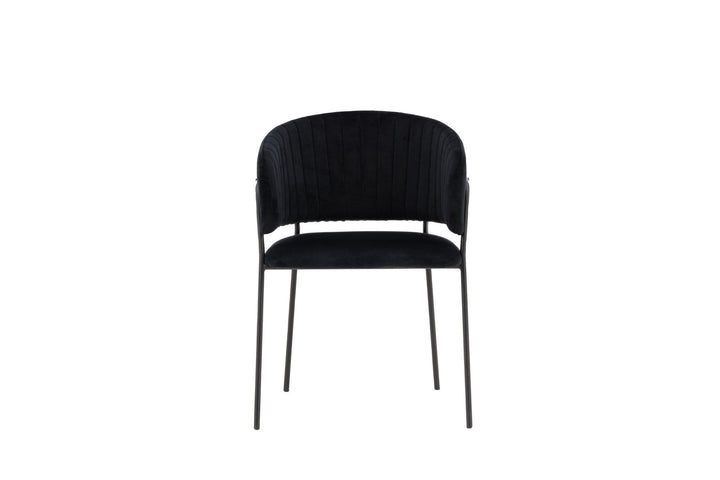 Feine Ziersteppungen verleihen dem Stuhl zusätzlichen Charakter und unterstreichen seine stilvolle Optik. Die schlanken Beine aus schwarzem Stahl setzen einen eleganten Kontrast zum weichen Samtbezug und sorgen zugleich für Stabilität.