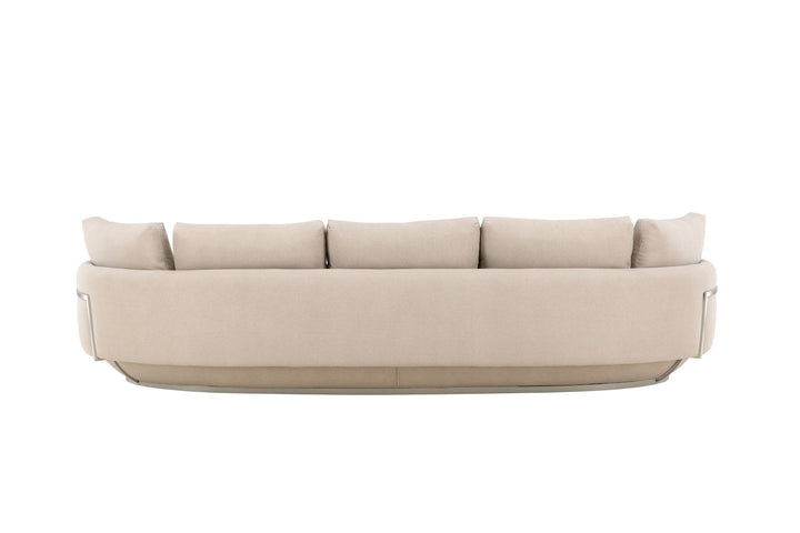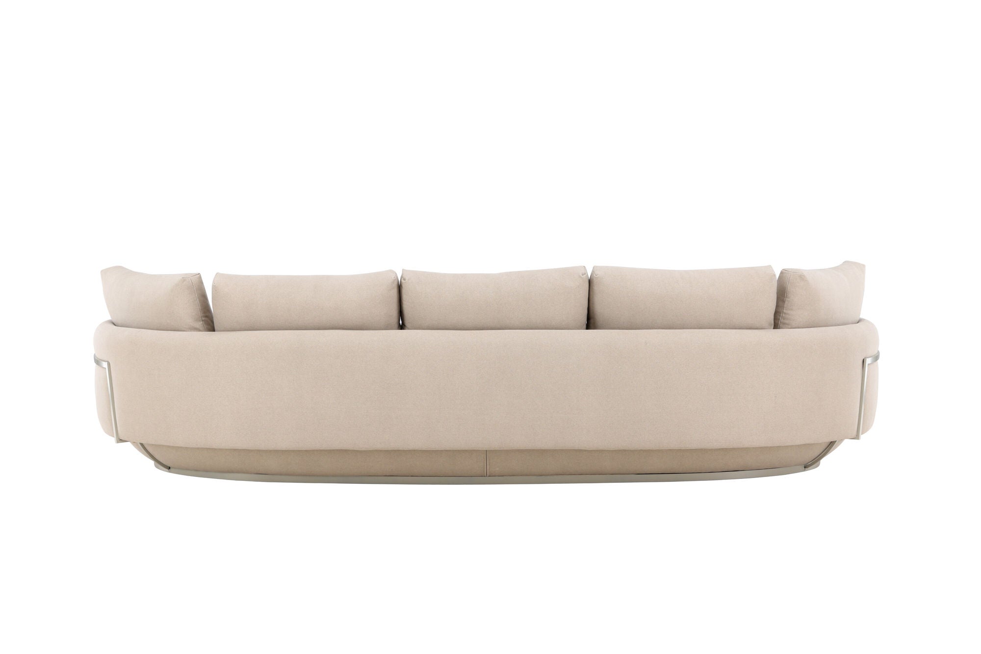 Mehrere mitgelieferte Kissen erhöhen nicht nur den Sitzkomfort, sondern verleihen dem Sofa auch eine besonders gemütliche und einladende Atmosphäre. Der neutrale Beige-Ton des Stoffes harmoniert perfekt mit dem beige lackierten Metallgestell und sorgt für einen modernen, zugleich zeitlosen Look.