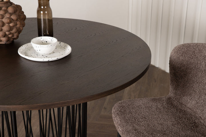 Der runde Esstisch Stone besticht durch sein modernes und trendbewusstes Design. Die Tischplatte aus MDF mit edlem Mocca-Furnier verleiht dem Tisch eine warme, natürliche Ausstrahlung, während das schwarze, zylindrische Metallgestell für Stabilität und einen stilvollen Kontrast sorgt.