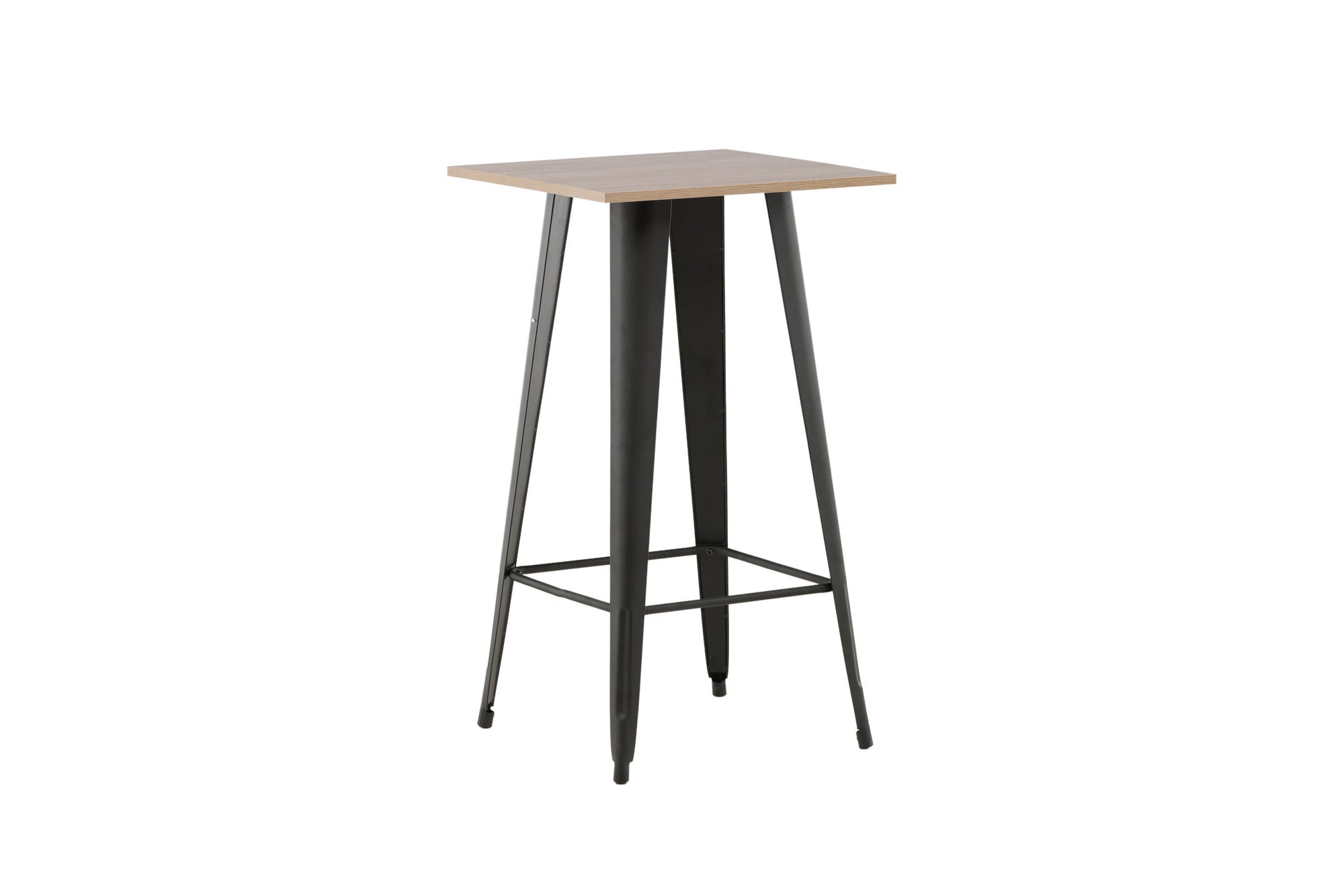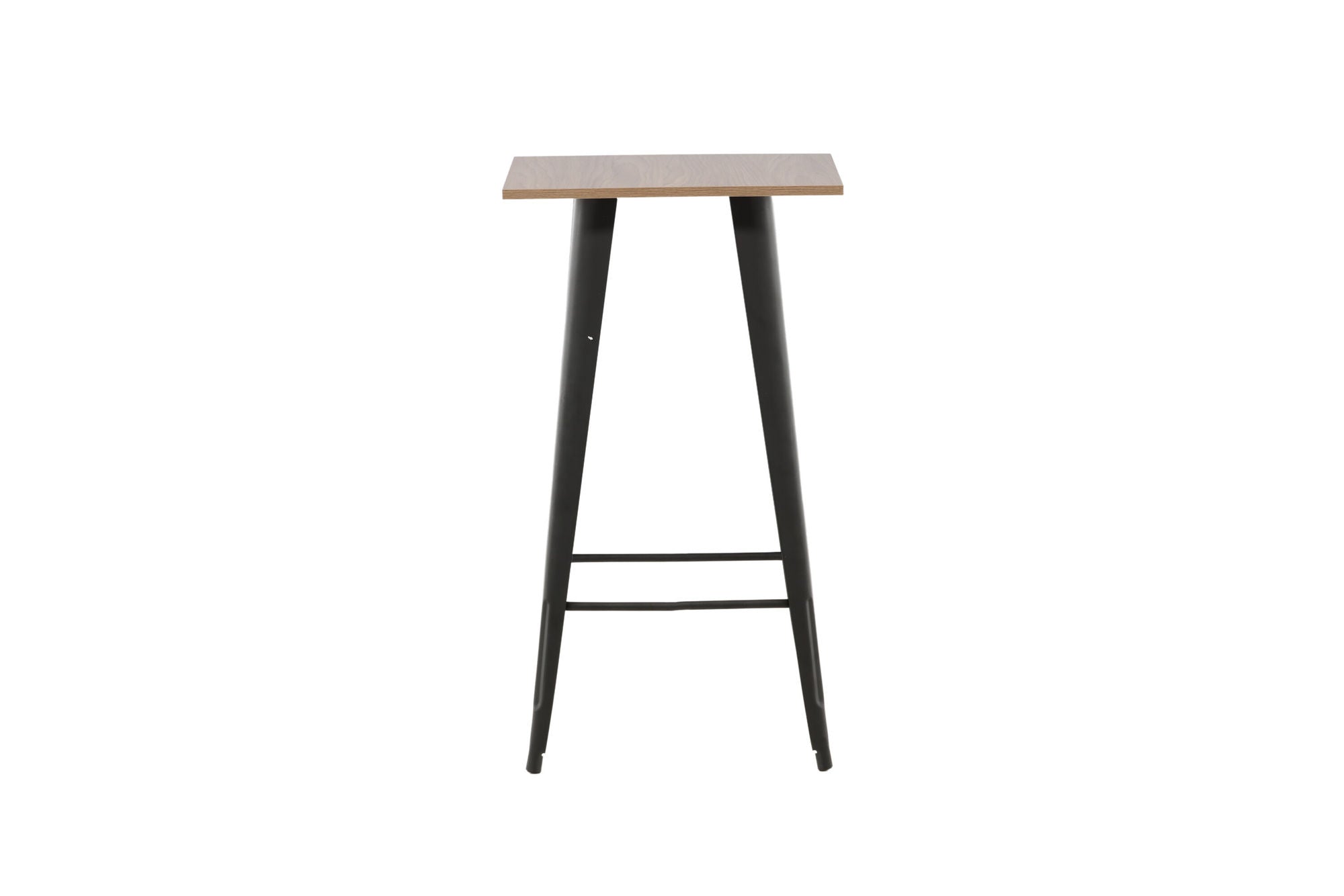 Die quadratische Tischplatte aus MDF in Walnuss-Optik sorgt für eine warme Ausstrahlung, während die schwarz lackierten Metallbeine in leicht ausgestellter Form für Stabilität und ein elegantes Erscheinungsbild stehen. Ein integrierter Fußtritt bietet zusätzlichen Komfort.