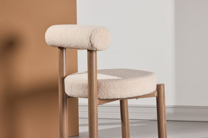 Die Sitzfläche ist mit weichem, weißem Bouclé bezogen und sorgt mit ihrer warmen, strukturierten Haptik für ein besonders einladendes Ambiente. Zusammen mit dem stabilen Gestell entsteht ein Esszimmerstuhl, der sowohl praktisch als auch stilvoll ist.